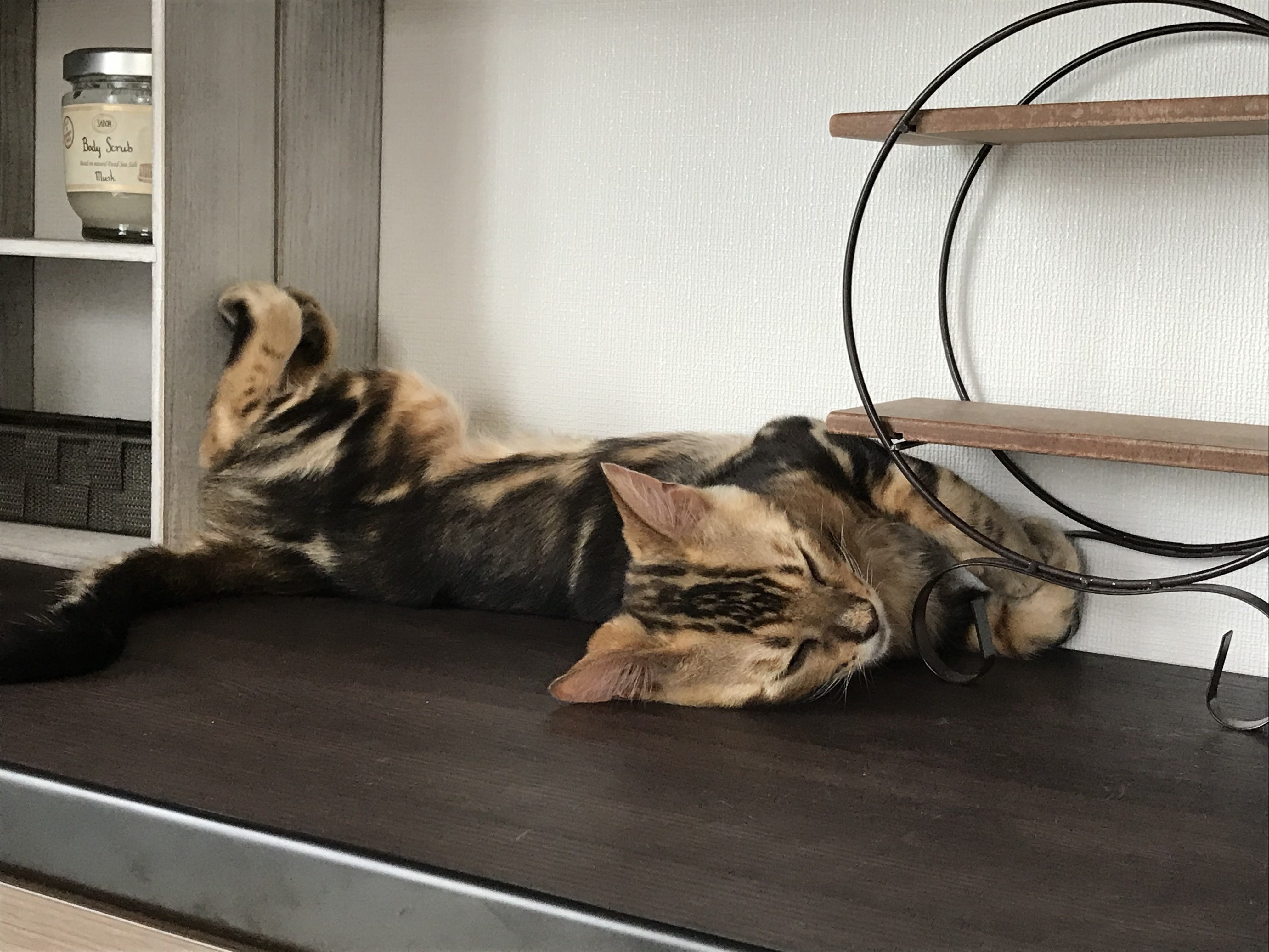 広い場所はいくらでもあるのにチェストの上で壁にくっついて眠るレオン。その寝方、辛くないですかね??もりもり食べ、もりもり遊び、順調なレオンただ、便秘気味なのは相変わらずでない訳じゃないんです。ただ、やはり3日に2回とか硬さも「少し固めかな??でも柔らかい所も多いし・・・・」といった感じ。レオンはドライフードがあまり好きではないようです。食べない訳ではないのですが、よっぽどお腹が空かないと食べない。なのでパウチにドライフードを混ぜて毎食食べさせてます。その後。大好きなミルク。ミルク大好き。なので水分が足りないとは思えない。と、もんもんとしたまま2週間が経ちました。それ以外はとっても順調。体重も増えてます。2週間に1回の病院で毎回ムティアンの量が増えてます。先日の病院で先生に「ふっくら」と言われてしましました。ウルソ錠1日一粒。ムティアンとは分けて与えます。食欲旺盛なので、朝ごはんのカリカリ、パウチ和えに投入すると一緒ガリガリかみ砕きます。特に問題なし。ムティアンの飲み方も上手になり・・・・・(観念したともいう)ご褒美ちゅーるも美味しく食する。暗くてすみません。テーブルの下レオンは寝てても起きてても下半身はいつもひっくり返ってます。