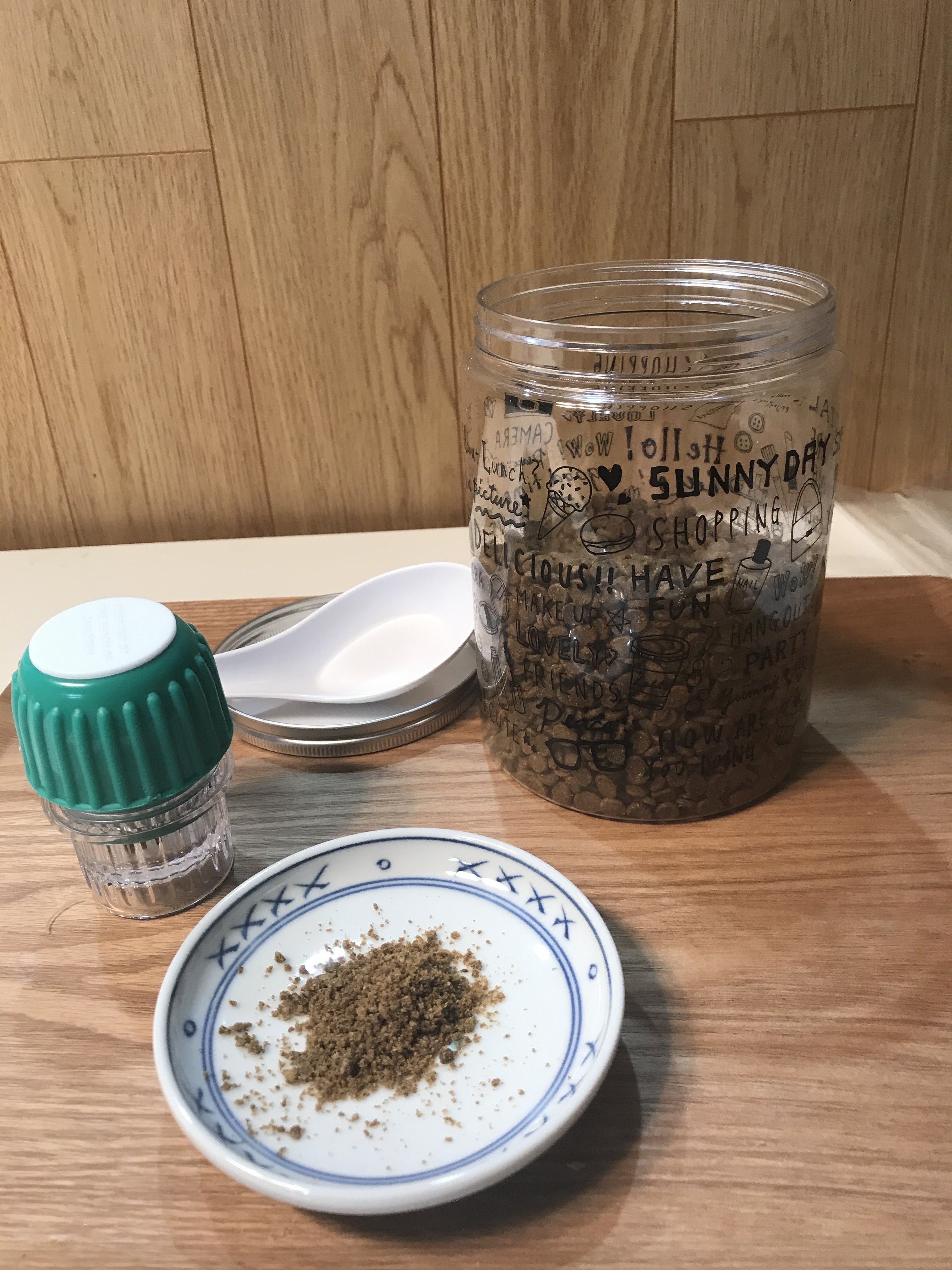 経過報告その5(FIP発覚)(写真がいつも横向いててすみません) 閑話休題闘病生活のレオンの食生活。元々、ドライフードをふやかして、パウチを少し混ぜてあげてました。があまり食べなくなり病院につ入れ言った時、病院のカルカンを完食したレオン。パウチをカルカン(子猫用)に変更しました。しかし、それも病気と共に食欲がなくなっていき・・・絶食状態が数日続きました。。。。↓↓ ↓ ↓ ↓ ↓ ↓ ↓ ↓ ↓ ↓ほとんどご飯を食べなくなったレオン少しでも栄養を取ってほしいのでドライフードをふやかしたりパウチをさらにつぶして食べやすくしたりと工夫しますが全く食べない。病院で食べていたカルカンですらぷい。それでもちゃおチュールだけは食べてくれました。本当、ちゃおチュールってすごい。何が入っているの?じゃあ、とご主人は悪知恵を働かせてちゃおチュールにふやかしたドライフードを忍ばす。レオンはちゃおチュールだけ器用に舐める。じゃあ、とご主人は悪知恵を働かせてドライフードを包丁で砕いて小さくしてからちゃおチュールにてを忍ばす。レオンはちゃおチュールだけ器用に舐める。こういった攻防が何度も続きました。圧倒的に栄養不足なので総合栄養食も食べさせたい。そこでこれピルクラッシャーというもの本来はお薬を砕いて犬や猫に飲ませる時に使うもの。買う前は歯かなんかがついていて砕いてくれるのかと思ったのですが・・・・砕くというか・・・・すり潰すという・・・・思ったより力業の商品でした。あの、ゴマをすり鉢とすりこぎで作る要領。これに栄養があるドライフード(総合栄養食)をいれてひたすらすり潰します。レオンが取り除けない程ちゃおチュールに混ぜてしまおう、という作戦。砕く(すり潰す)とこんな感じ。これをひたすら繰り返す。腱鞘炎になるまで繰り返す。これだけの量でも結構手首にくる。これを数量ずつちゃおチュールに入れて食べさせる。食べた!皆様もお試しあれ。