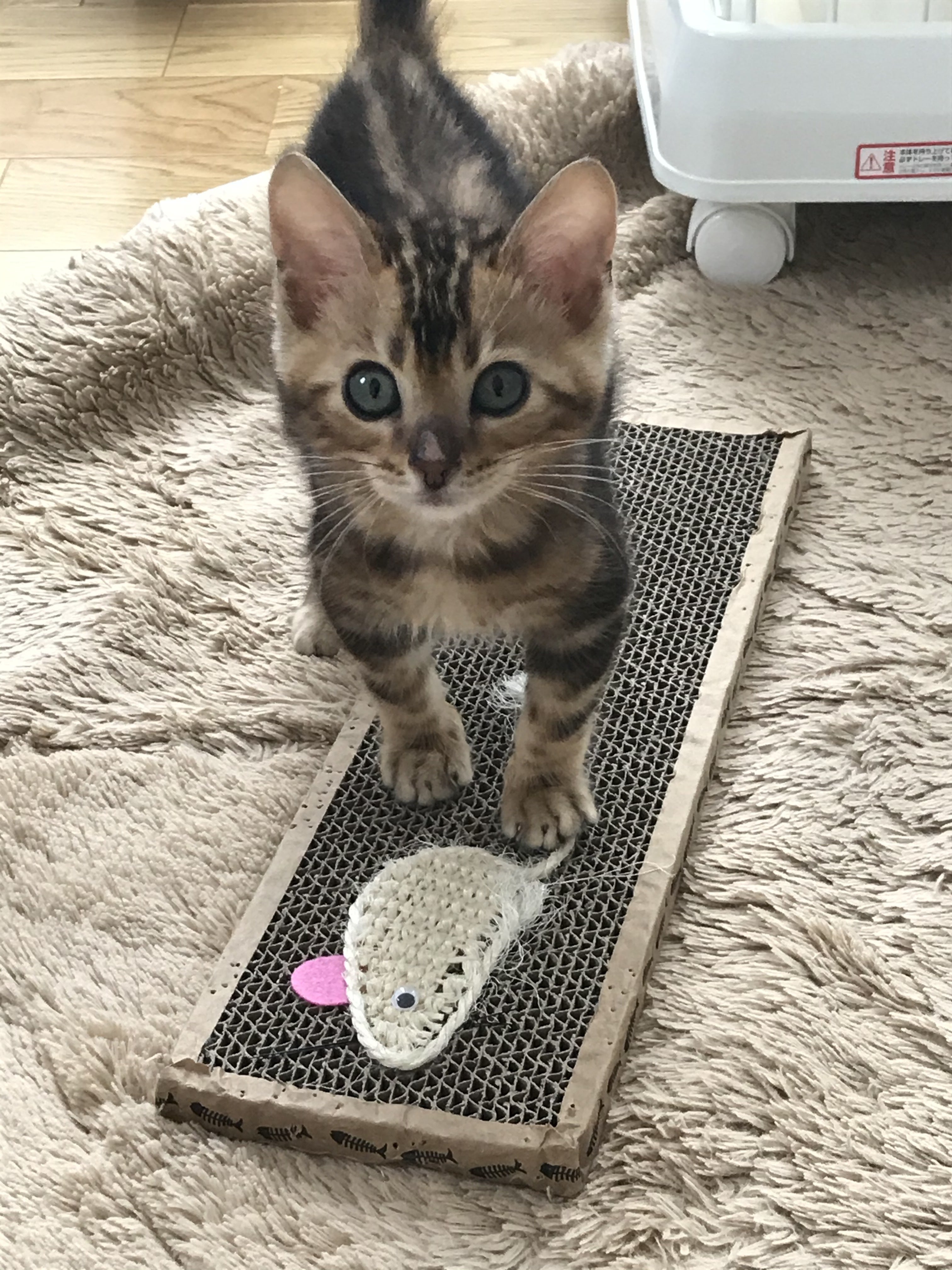 こんにちは。クラウドファンディングを公開してから3日くらいでしょうか?4名の方にご支援いただきました。本当にありがとうございます!!!レオンよかったね。今日はちゅーるで乾杯しようね。この人数が多いとか少ないとかはあまり関係なくて、応援頂けることが凄く嬉しいです。メッセージまで下さった方、ありがとうございました。レオンと一緒に拝見しています。後ほどお返事させて頂きたいと思います。経過報告という事ですが、今回は最初という事でFIP発覚前の元気な頃のレオンをアップします5/6のレオン初めて出会った日です。生後3カ月で560g大変元気。元気すぎてお鼻をケージにブツケまくってちょっと剥げてしまっているとの事。ドライフードをふやかして、パウチに混ぜて食べさせる。食への興味は少なめであんまり食べてくれない。だからこんなに小さいのかな。5/16のレオン食べることより遊ぶこと優先。とにかく元気。でも、この頃からやっと食欲が出てきてみるみる体重が大きくり、一安心。小さいのは可愛いけど心配でご主人(私)の白髪が増えてしまうので、はやく大きくなってほしい。ドライフードだけでは絶対食べない。パウチと一緒。我儘なのか、グルメなのか、嫌いなのかがわからなくて四苦八苦。お気に入りのおもちゃは麻のボール。このオモチャは噛み尽くしてぺちゃんこになりました。。。。ここまで遊んでくれると嬉しい。オモチャへの好奇心はとても高くどんなおもちゃも一通り遊んでくれる。可愛くて仕方がないなんでもおもちゃになる。5/20頃のレオン大分大きくなった。生まれてから三か月で560gしかなかったレオンが半月程度で倍の1kgにこんなに一気に大きくなるもの??PCチェアの下が好きで仕事をしていると轢いてしまわないか心配になる。。。経過報告ではなく、ただののろけ写真です。今後、レオンは病気と闘っていくわけです・・・・・まだこちらのサイトの勝手がつかめず・・・・・不手際があったらすみません。(タグってなんだろう?)今後は支援者の方だけの限定公開なども視野に入れ報告を行って行きたいと思います。ここまでご覧頂きありがとうございました。