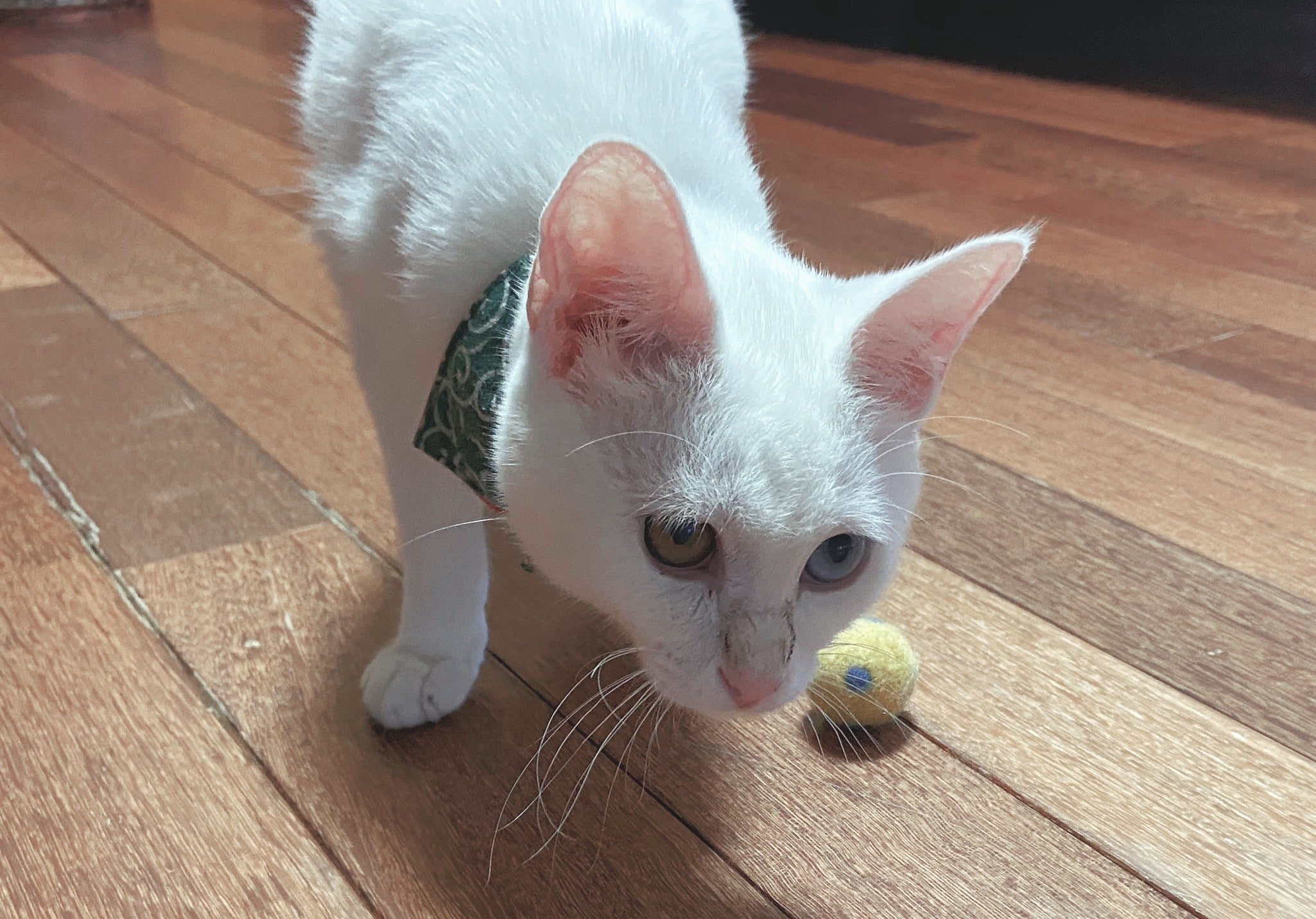 FIPと診断されるひと月ほど前から食事量が減り、長い時は2時間ほどおもちゃをコロコロしていたのに全く遊ばなくなっていたのですが、徐々に元気が出てきて短い時間ではありますが前からお気に入りのおもちゃで遊び始めました。