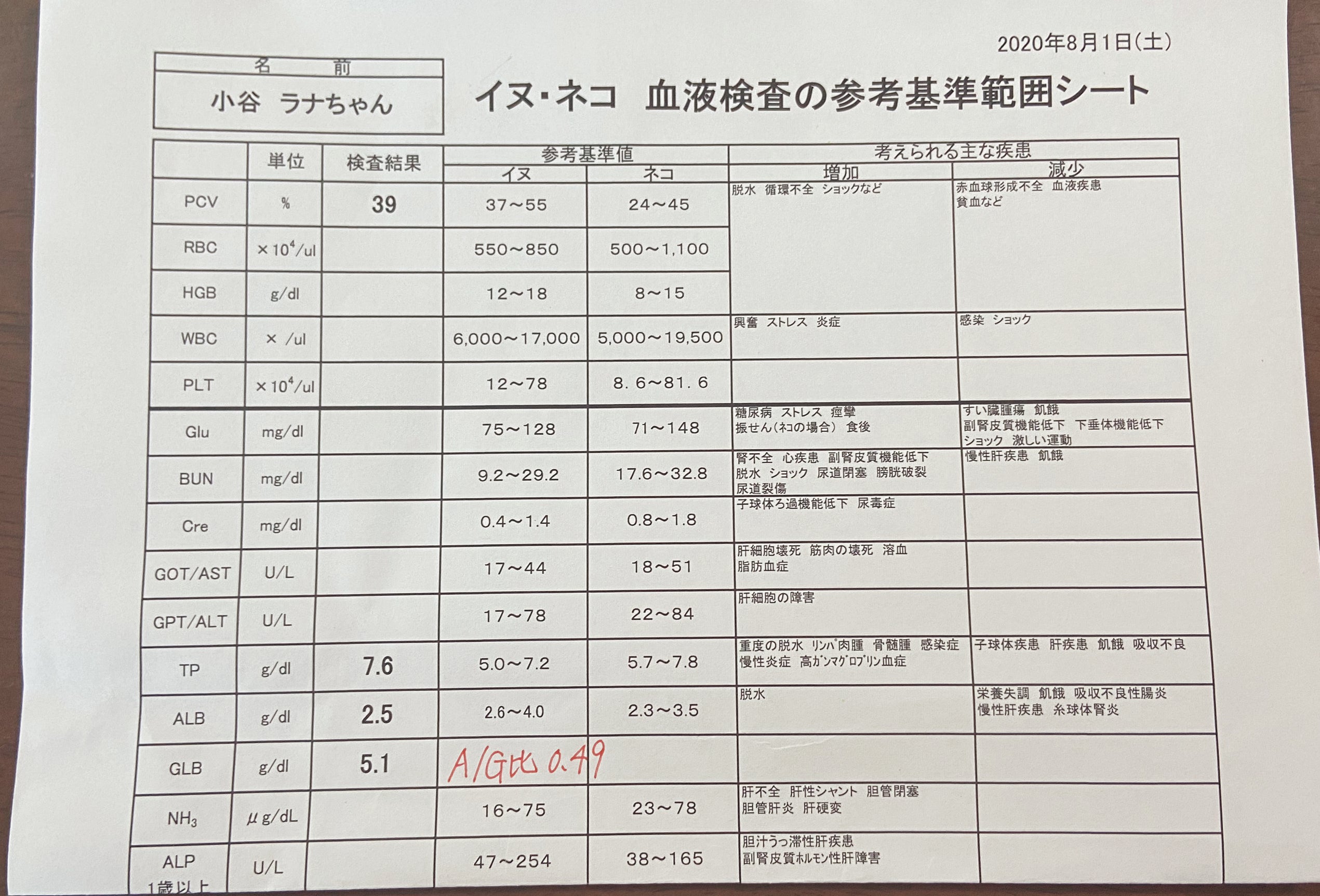 先生のお話では、本来ならば元気や食欲があり体重が増えていればA/G比が中間目標である0.6ぐらいに上がっているはずらしいのですが何故か上がっていません。