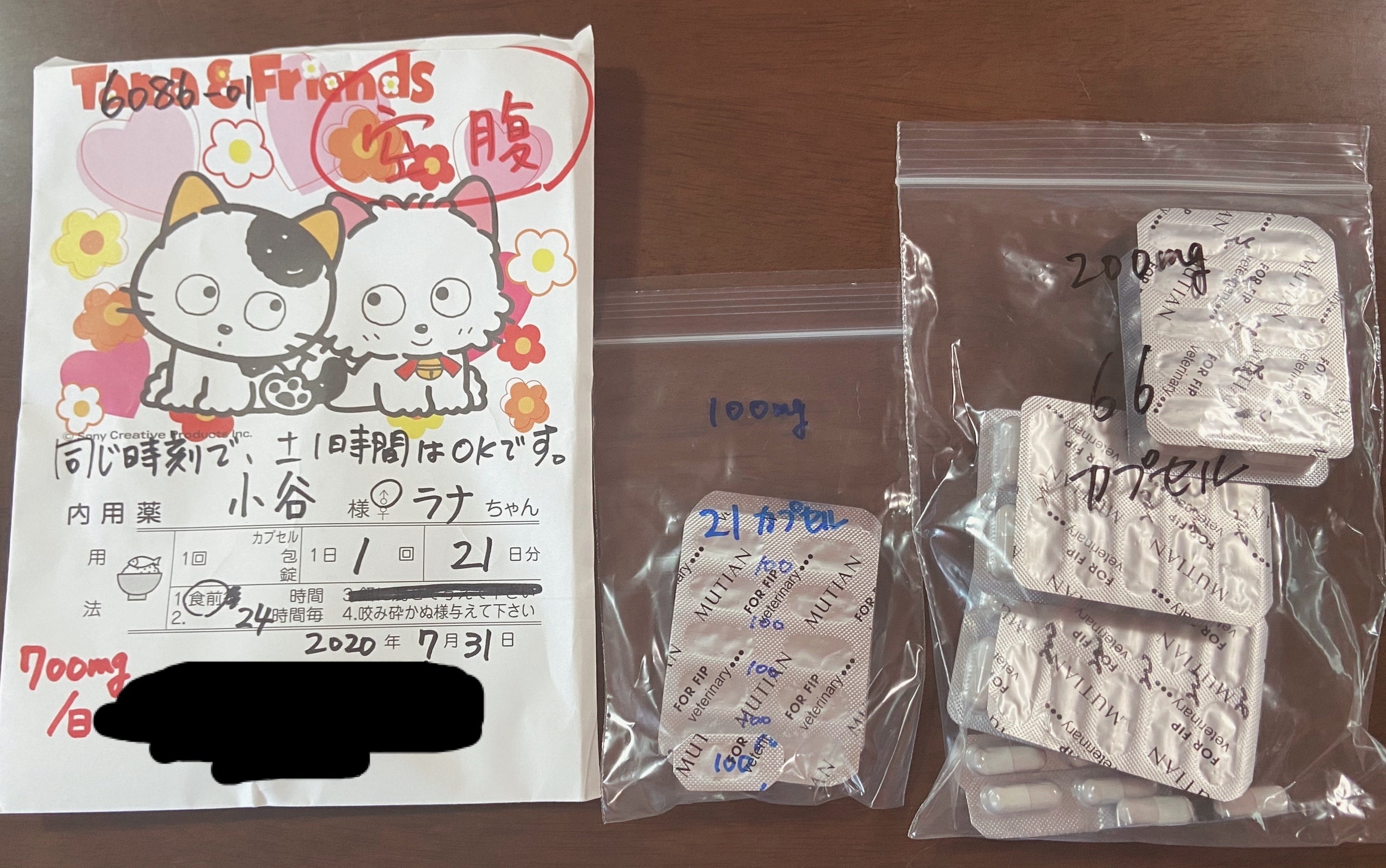 投薬は順調にいけば8月29日に終わる予定で、あと4週間近くあるのですが今回の処方は700mgの3週間分です。今までに200mgのカプセル3錠失敗していますのでその分を足していただいています。