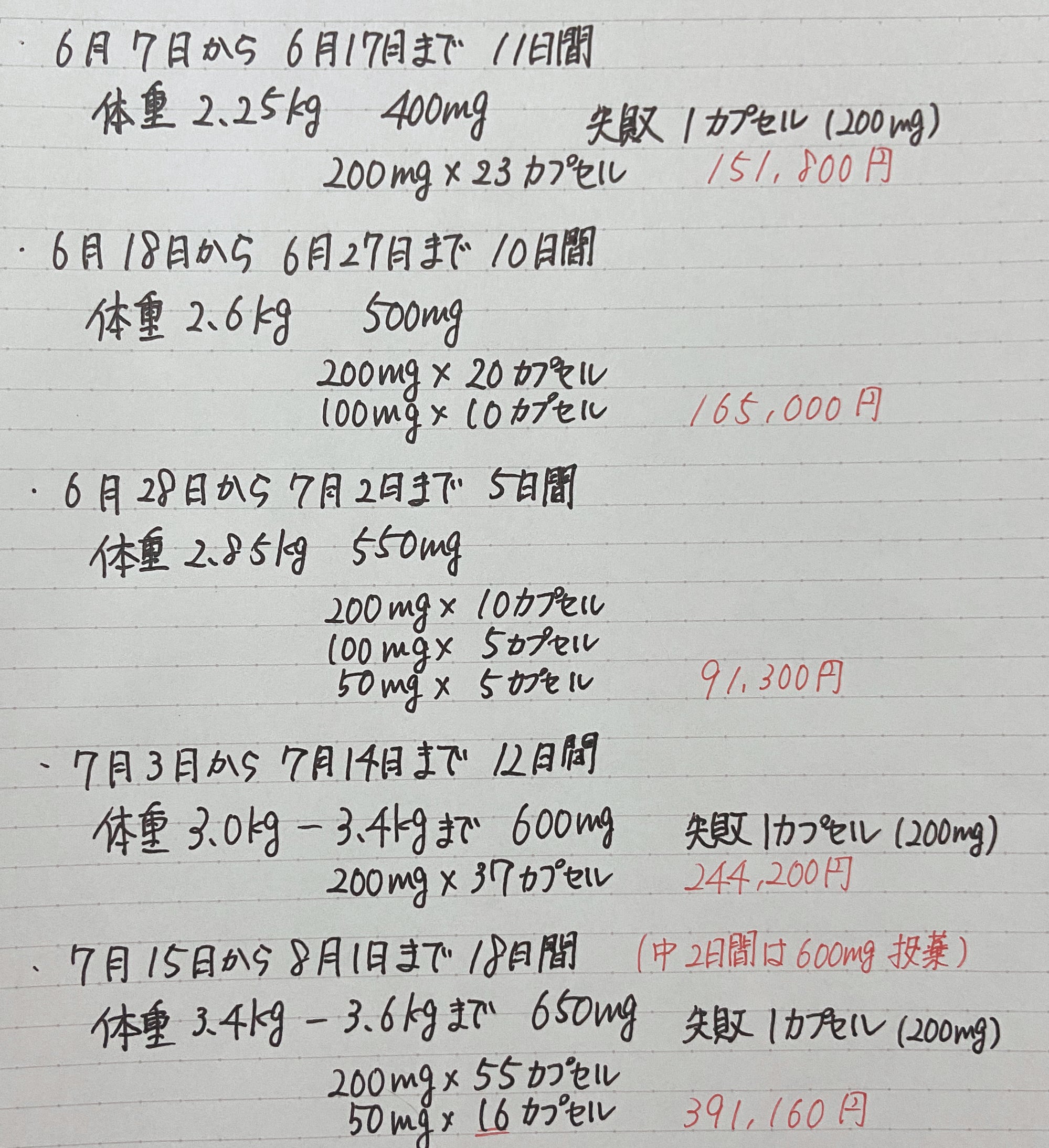 12週間の投薬終了後に全てをまとめたものを再度投稿いたしますが、8月1日までの8週間にかかった投薬費をまとめました。