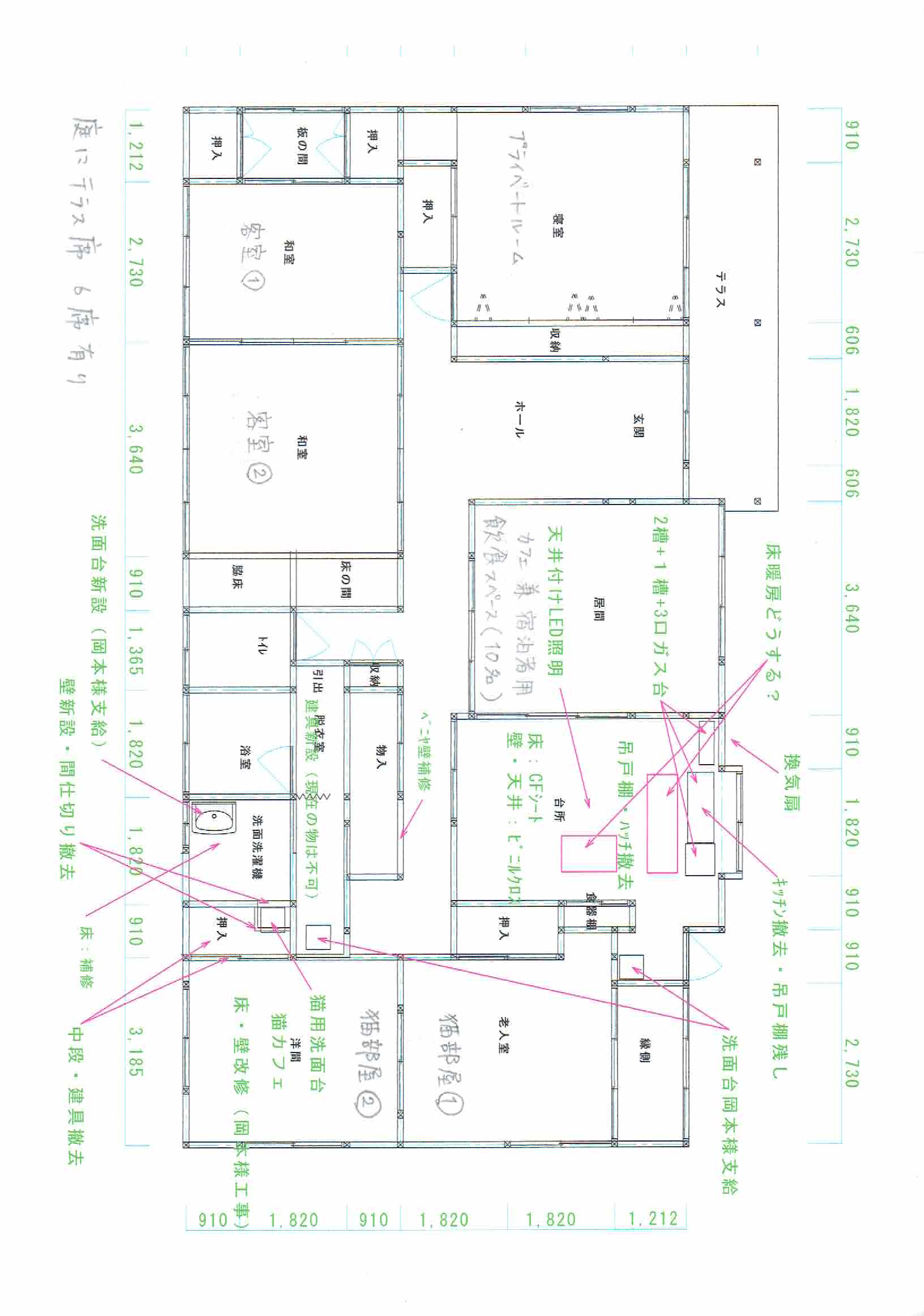 長野の家の改修設計図です。(向きが直せず見にくくてすみません。)最重要課題は、飲食店の許可を取る為のキッチンの改装。そして、猫部屋。猫部屋も動物取扱業の許可を取る為の改装が必要です。長野の猫部屋は6畳二間続きで使用します。今の店より狭くなりますが、ふすまで仕切る事ができるので、愛称の悪い猫達を別々の部屋で生活させることも可能。「老人室」と書かれている部屋は畳敷の和室。もう一部屋は納戸の為、床や壁がむき出し。こちらは押し入れを壊して洗面設備を作り、床板と壁紙は自分でやります。お客様に泊まって頂く客間は、6畳と8畳の2部屋。定員は2部屋合わせて5~6名。6畳間にはシングルベッドを1つ用意します。基本はB&B(ベッド&ブレックファスト)スタイル。素泊まり+簡単な朝食付き。宿泊客の方には、猫部屋利用をサービス。 お風呂は徒歩3分の所に日帰り温泉「坂北荘」がありますので、そちらをご利用いただきます。電車だと、長野ー松本間を走る篠ノ井線の坂北駅が最寄、と言っても車で15分程なので駅まで送迎します。ローカルな篠ノ井線は、のんびりしていて乗っていても楽しいですよ。車だと麻績インターから20分程です。裏庭にはピザ窯を作ります。家の前は500坪の畑。好きな野菜を収穫して、ピザを焼いていただくのもいいかなと思います。夜は満天の星。すぐ近くの差切渓谷では蛍を見たり、川魚を釣ったり、ご希望なら庭にテントを張ってグランピングも。「何もないけど何でもできる」猫と人間がのんびりと共生できる癒しの場所へ是非、遊びにいらして下さい。