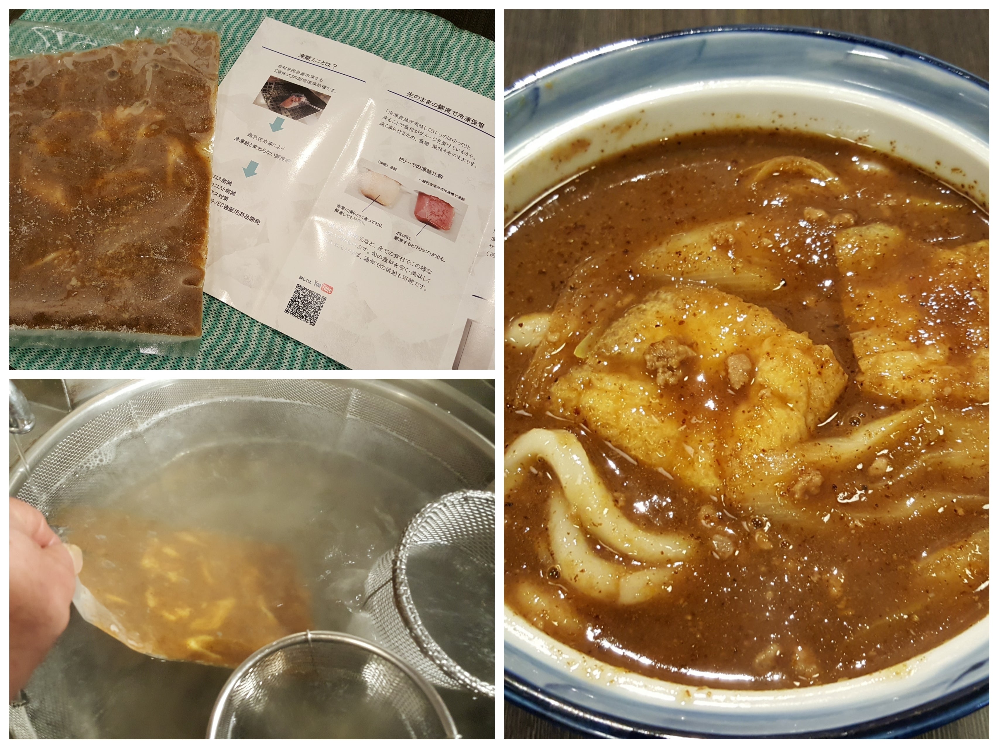 ↑写真左上はメーカーでの実演試験で凍結させたカレーうどん、左下は湯煎の様子、右は出来上がったカレーうどん