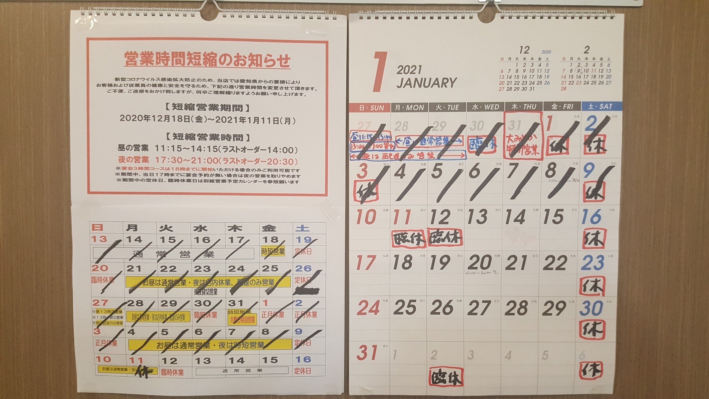 2021/01/10 09:00おかげさまで昨日、目標額300,000円を達成しました!ご支援いただいた、おひとりお一人に感謝申し上げますm(_ _)mあと2週間、より多くの皆様に恩返しできるよう案内を推進してまいります。引き続き、皆様の温かいご支援をよろしくお願いいたします!画像は今週の店舗予定カレンダーです。大変恐縮ですが、1月11日と12日は臨時休業いたします。また、県の要請による時短営業は2月7日まで延長されました。引き続き、要請に従った営業を実施してまいります。また、使いきれていない食事券は期間を延長しますので、安心してお手元にて大事に保管願います。どうか皆様には健康に留意してお過ごしください。 もっと見る新年おめでとうございます!