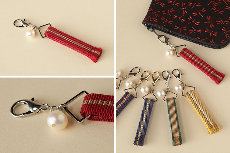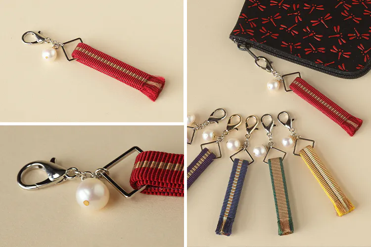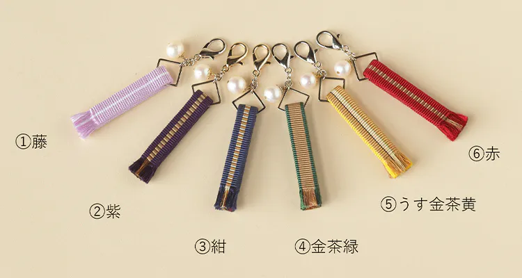 織柄と伝統色が美しい9ミリ幅(3分幅)の絹真田紐を重ね合わせ、淡水真珠を添えたチャーム。ファスナーに付けたりカバンなどのストラップとしてもおすすめです。