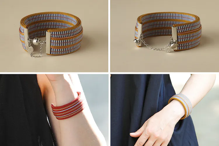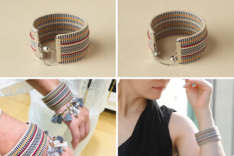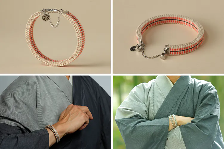 袖口からのぞく細身のブレスレットで、いつもの着物スタイルに“遊び“を加えて楽しむことができます。そして、意外な使い方になりますが、帯飾りの根付にも使えるブックマーカーもおすすめです!自分オリジナルが際立つおしゃれアイテムとなれば嬉しいです。また、ジャケットの胸元にもさりげなく和の雰囲気を。ブレスレットとの色合わせで楽しむのもいかがでしょうか。