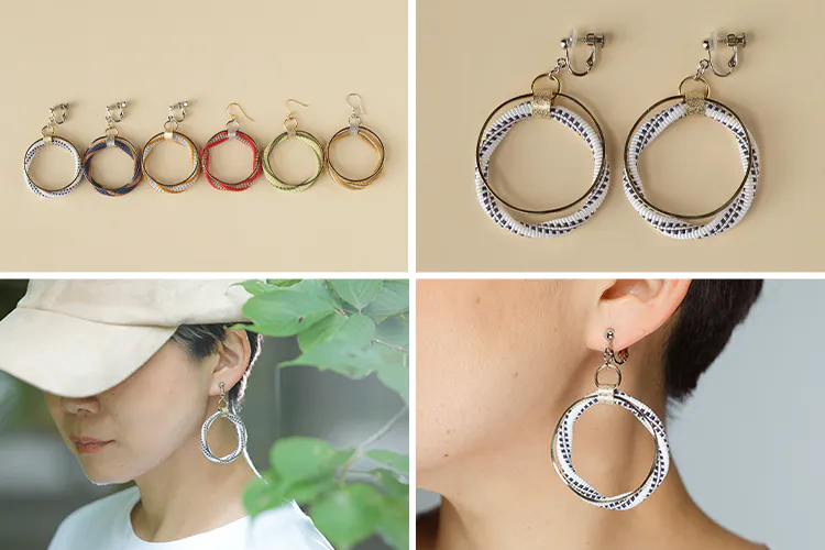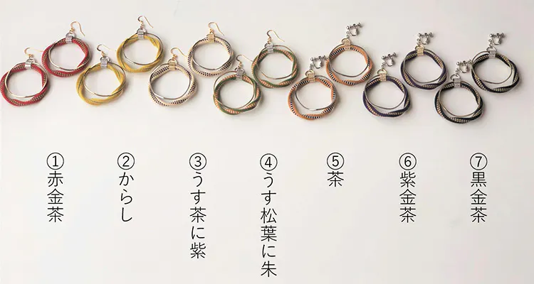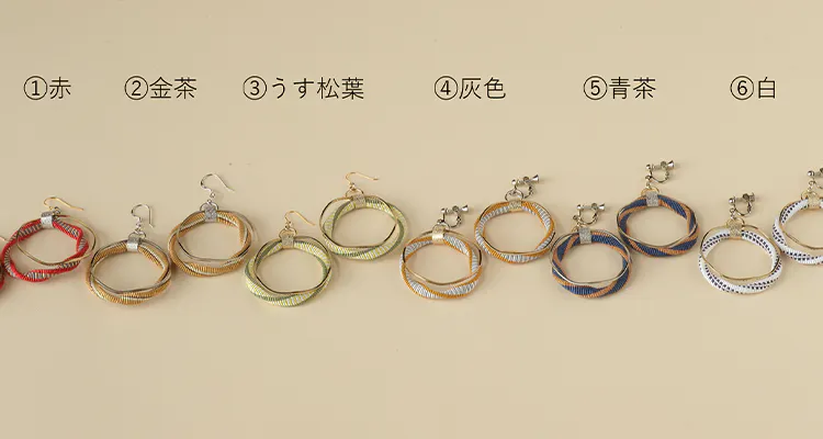 6ミリ幅(2分幅)の絹真田紐の織柄を活かせるようひねって金属フープ型とあわせた軽いイヤリングピアス。カジュアルにもきれいめにも合わやすく、 洋服の色と合わせたコーディネートもおすすめです!