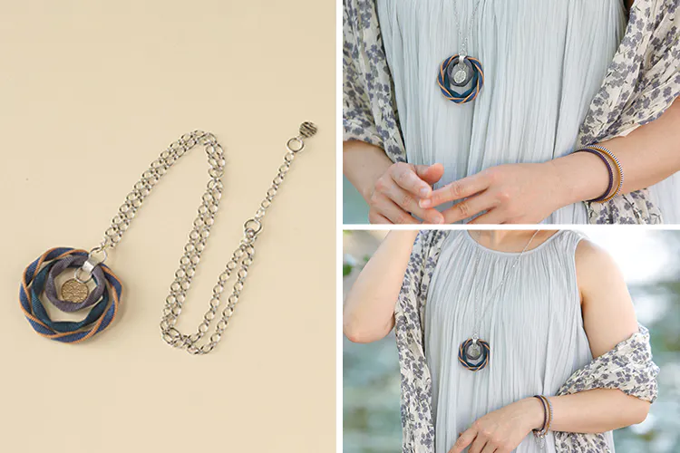 6ミリ幅(2分幅)の絹真田紐をねじりお花のように仕上げたペンダント。中央には和柄の透かしパーツを添えてアクセントにしました。気軽に身に着けられる心地良さです。