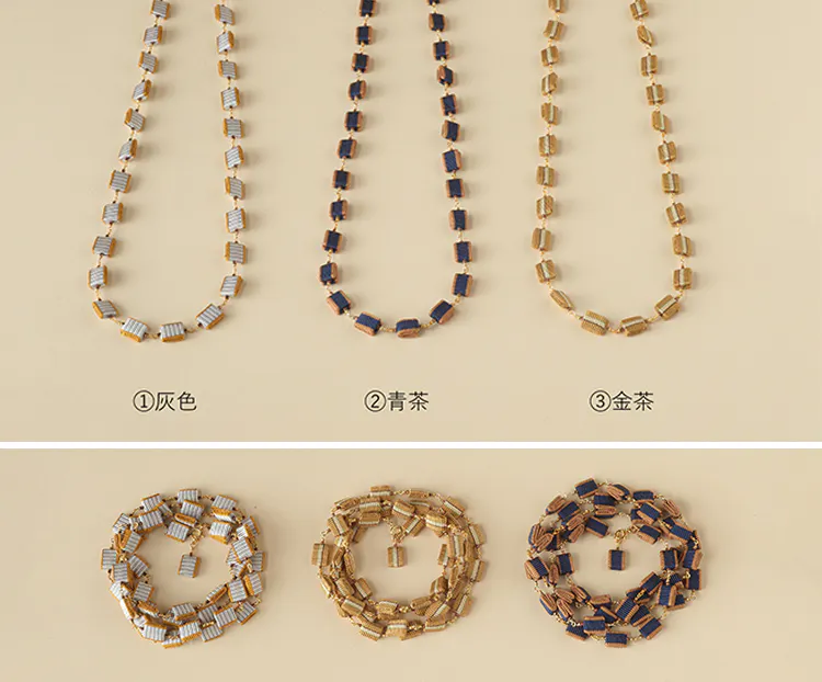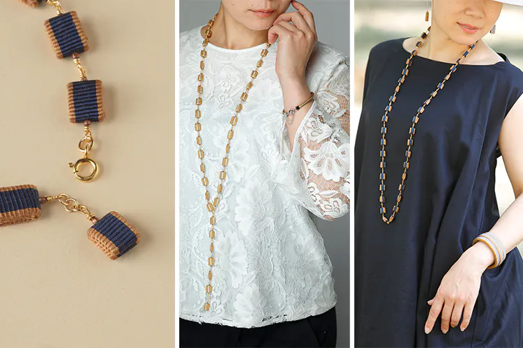 9ミリ幅(3分幅)の絹真田紐をスクエア型に加工しつなげた軽くて肩の凝りにくいネックレス。留める箇所をお好みで変えられるのでラリエットにもネックレスにもなり、洋服に合わせやすいアクセサリーです。