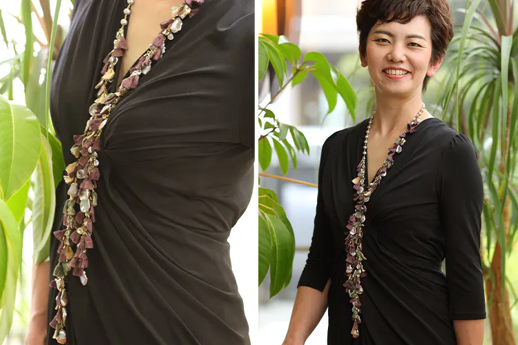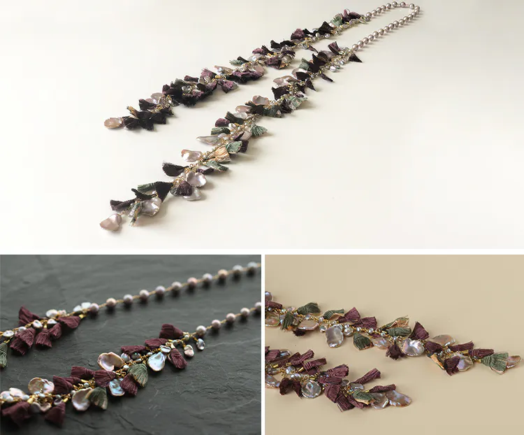 絹真田紐を房状に加工し、花びらのような淡水真珠とあわせたエレガントなラリエット。絹と淡水真珠の艶が相性良く、さらに上品さを増してくれます。