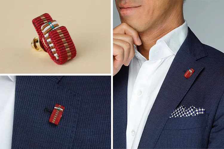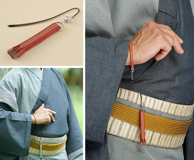 バッグや小物入れのチャーム、ジャケットや帽子のタックピン(ピンブローチ)、一息入れる読書のしおりなどにも真田紐アクセサリーは、和洋折衷の存在感を発揮してくれます。