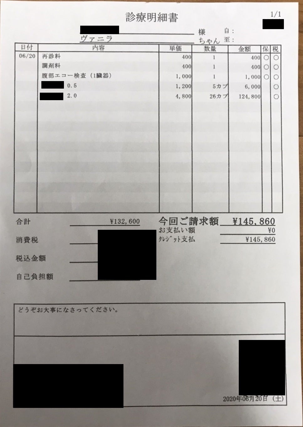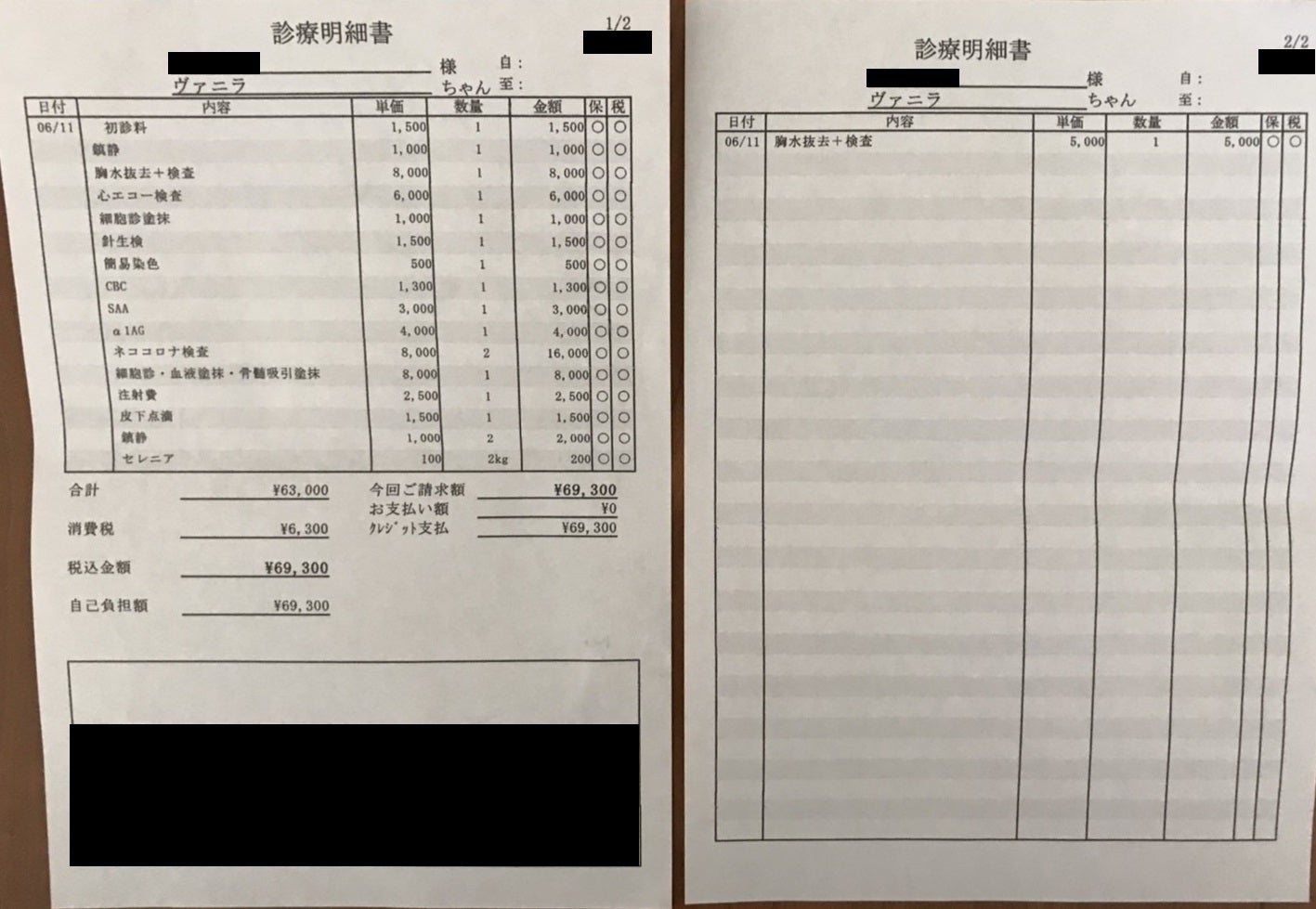 異変を感じてからFIPウェットタイプと診断されるまでに、検査代等で30万弱かかっています。