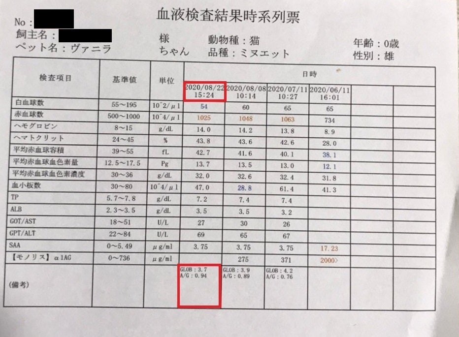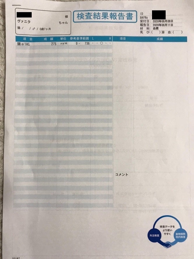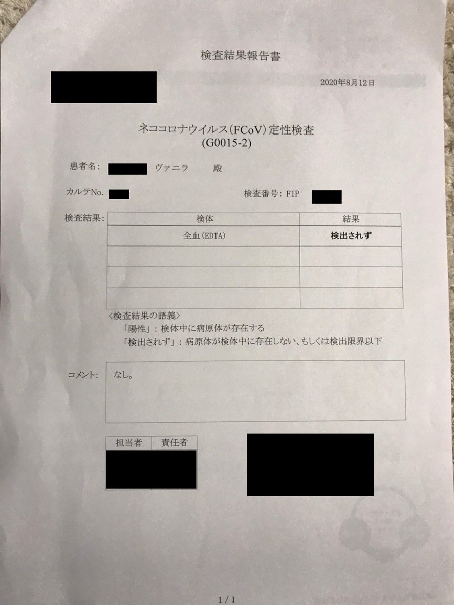 猫コロナウイルスも検知されず、炎症マーカーも正常値(前回からも減少)でした。