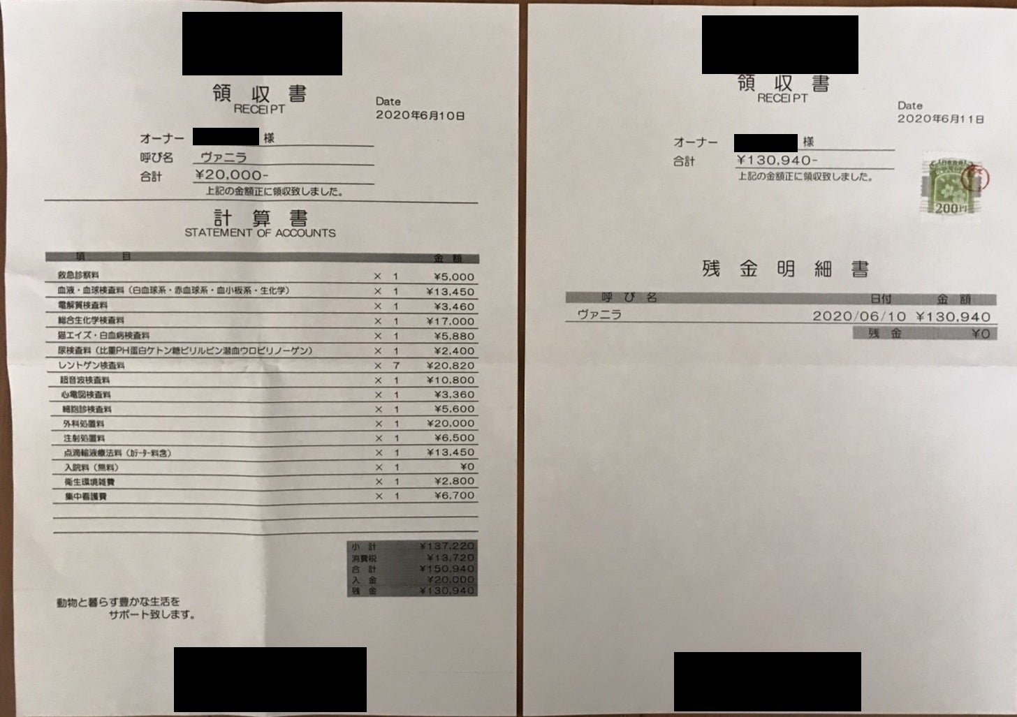 異変を感じてからFIPウェットタイプと診断されるまでに、検査代等で30万弱かかっています。