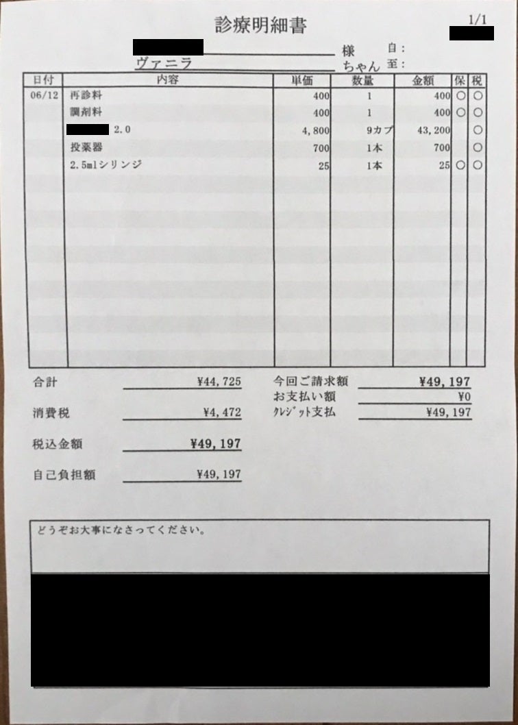 200mgのカプセルが1粒5280円(税込)なので、単純計算をして、約45万円となります。今後ヴァニラが順調に成長すれば投薬終盤には体重が増えるため、投薬量も増やす必要があります。先生からは、通常の体重増加ペースであれば、薬代だけで90万程度、検査代等も含めて総額150万程度と言われています。