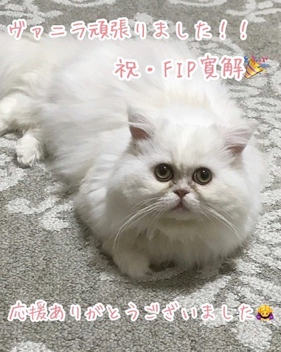 2020/12/31 23:51皆様こんばんは('ω')ノ ヴァニラの飼い主のサキです。あっという間に年末ですね!年の瀬ぎりぎりの投稿となりすみません・・・。今年は私たち家族とヴァニラにとっても怒涛の1年でした。2月に我が家にお迎えし、6月にFIPが発覚…そこからは皆様に支えられての闘病生活でした。そして遂に・・・〇寛解のご報告!!12/5に経過観察最後の検査を行い、無事【寛解】のお言葉をいただきました!(血液検査の結果は後日ということで、12/11に電話で最終的な報告をいただきました。)FIP発覚から約半年、長いようなあっという間だったような不思議な感覚です。不安や大変なこともたくさんありましたが、乗り越えることが出来たのは応援してくださった皆様のおかげです。本当に本当にありがとうございました。〇去勢手術最終検査の日に去勢手術の予約をし、12/17に去勢手術を行いました。実はヴァニちゃん、経過観察中に発情期になってしまい・・・マーキング行為はしていないものの、食欲が落ちたり私のパジャマにすり寄ってきたり、そのままにしておくのも良くないとのことなので、先生に相談して去勢してもらうことに。再発の引き金にならないかなど心配でしたが、無事終了し大丈夫そうです!硬いカラーはストレスになるかな?とお花の形の薄いカラーをつけていました✿〇ヴァニラ1歳のバースデー12/24はヴァニラのお誕生日でした~!FIP発覚当初はこの日を迎えられるとは思ってもおらず、本当に感激です。猫用バースデーケーキを用意してみましたがあまり食いつかず、チュールをあげました( ;∀;)家族みんなででお祝いしました★〇これからのことキャンプファイアーでの活動報告は今回をもって終了とさせていただきますが、これからもヴァニラの様子はTwitterやインスタで更新していく予定ですので、良ければこれからも見守ってくださると嬉しいです。〇Twitter:vanillad_1223〇インスタ:vanistagramこれからもヴァニラと共に日々が過ごせること、何より幸せに感じています。皆様からいただいた優しさは一生忘れません。これから少しずつでも、恩返しをしていきたいと思っています。1日でも早く、FIPで苦しむ猫ちゃんがいなくなりますように。また、早く新型コロナウイルスの流行が収まり日常を取り戻せますように。よい2021年をお迎えくださいませ('ω')ノ2020年12月31日 ヴァニラまま・サキ もっと見る経過観察とリターンのご連絡