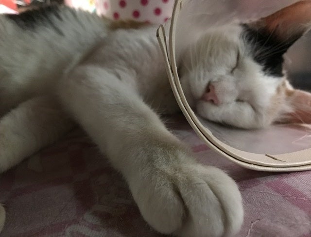 避妊手術また報告遅くなりましたが、8月20日(木)に以前から予定していた避妊手術を行いました。手術前日の夜7時までに食事をして、それ以降は食べないこと、夜中の12時まではお水を飲んでも良いが、それ以降は飲まない様にと言われました。手術後に何か用意するものがあるか尋ねた所、「特に何もないです。」と言われました。術後服など用意するものだと思っていましたが、エリザベスカラーをつけているので不要だそうです。ミーコを午前中預けて、午後にはお迎えに行きました。無事避妊手術が終わりホッとしています。家に着くと安心したのか、ずっと眠っていました。術後の食事はいつもの半分くらいの量にする様に言われましたが、ミーコは食欲がないらしく、いつもの4分の1程度しか食べませんでした。手術した所に絆創膏が貼ってありましたが、一部剥がれていたので、何気に手術した所を見てみましたが、出血もなく、キレイに縫われていました。次の日病院に行き、先生が縫った所を見ると、「もう剥がしちゃっていいや」と絆創膏を剥がし、「えっ?」と思いましたが、そんなものなのか…と思いました。その日は注射を1本打ちました。次の日にまた通院し、診察してもらいました。そして術後10日過ぎてから抜糸をするそうなので、9月1日(火)に抜糸に行って来ました。その時、お腹の虫が居なくなっているか検査をする予定でしたが、ミーコのウンチが全部スッキリ出てしまっていた様なので、検査が出来ませんでした。後でウンチを病院に持って行き検査をする事になりました。避妊手術が終わり、穏やかに過ごせるのかなぁと思っていた矢先、ミーコがトイレ以外でオシッコをしてしまい、またまた問題勃発。8月の始め頃に、布団でオシッコをして、怒っては逆効果と思い、「トイレはここだよ」と連れて行き教えたのですか、8月30、31日と2日連続で布団でオシッコをしてしまうので、何か原因があるのかと病院に相談した所、ウンチはトイレでして、オシッコも普段はちゃんとトイレでするけど、見ていない時に布団でしていたので、ミーコが「何か訴えたい事があるのか、もしくは膀胱炎の可能性もある」と言われました。膀胱炎の検査もするので、オシッコを採って持って来る様に言われましたが、待っていると中々ミーコはオシッコをしてくれず、ずっと寝ています。どうやってミーコのオシッコを採るか…悩み中です。