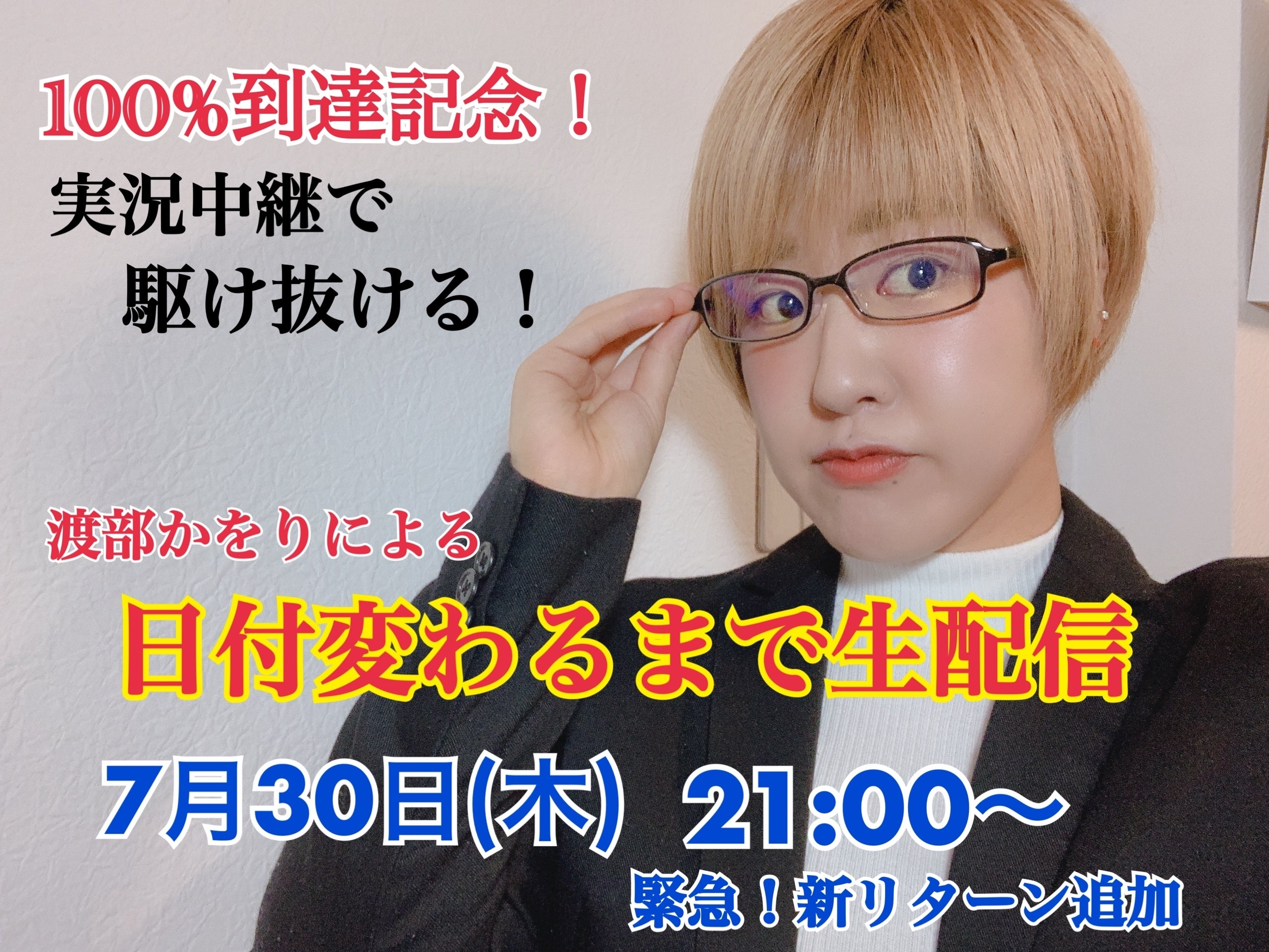 などに当てさせていただきたく、100%達成記念の新たなリターンの追加に加えて、クラウドファンディング最終日である7月30日21:00〜24:00過ぎまで配信を行います!(渡部かをり個人)