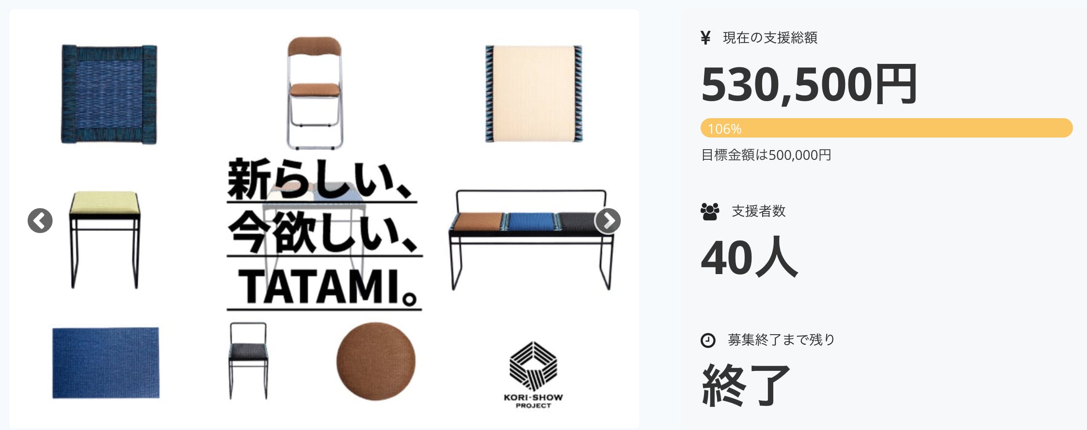 2020/08/01 19:44ご支援いただきました、40名の皆さま。昨日をもちまして、プロジェクトを終了させていただきました。初のクラウドファンディングでの試みにも関わらず、みなさまからのあたたかいご支援をいただき、無事目標金額を達成することができました。本当にありがとうございました。8月中旬よりご支援いただきました皆様へ順次お品物をご発送させていただきますので、商品の到着までもう少々お待ちください。日本だけの伝統文化である畳を、現代の暮らしの中で快適にお楽しみいただけるよう、開発を重ねた“TATAMI”が、皆さまの暮らしの中で愛され、長くご使用いただけることを願っております。今後も"日本の伝統文化"と"最新の技術"をかけあわせた、豊かな暮らしを創造できる”凝った”プロダクト開発を目指して参りますので、KORI-SHOW PROJECTをどうぞよろしくお願い致します。KORI-SHOW PROJECT 一同 もっと見る
