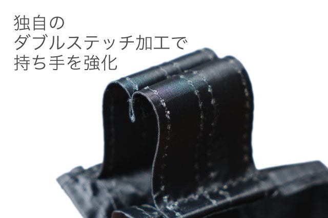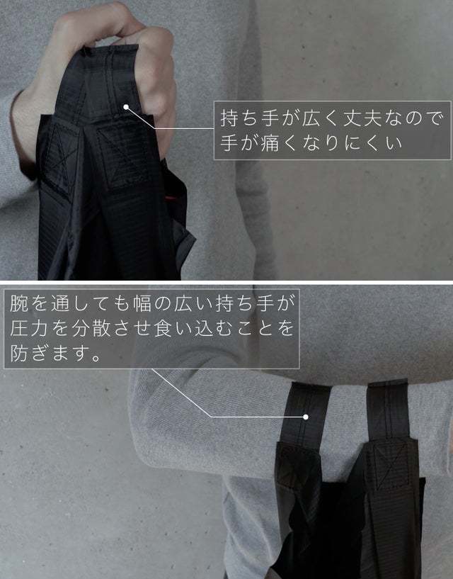 持ち手部分を独自の技術で強化することで、重い荷物も安心して運べます。持ち手を広くすることで、圧力を分散させ手に掛かる負担を軽減し、腕に通して持っても実際より軽く感じられる効果を生み出しています。