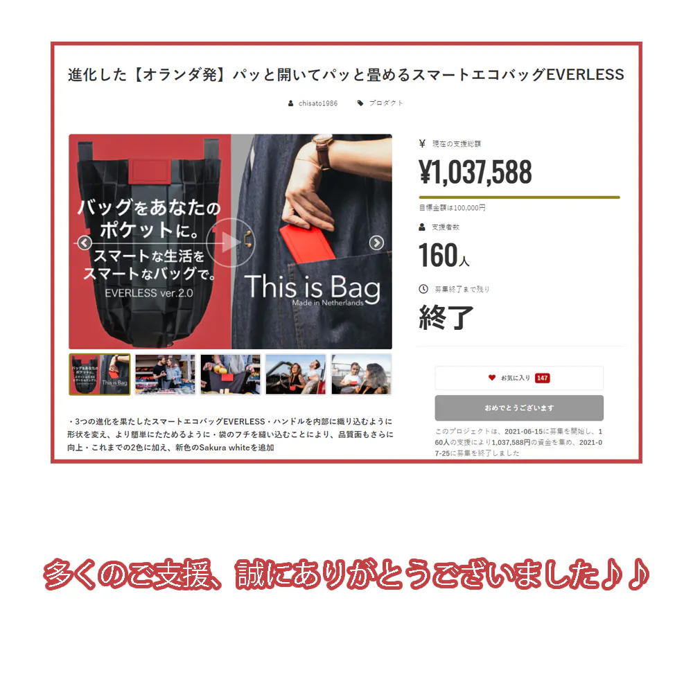 この度は私のEVERLESSのキャンペーンにご支援頂きまして、誠にありがとうございます。
