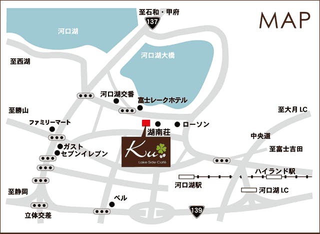 電車:富士急河口湖線河口湖駅より徒歩10分