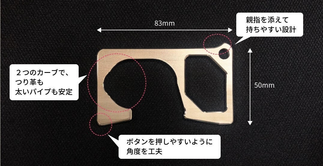 高い腐食性、耐久性を誇るチタンを素材に選び、1つずつ削り出して丁寧に仕上げたチタンフックです。ウイルスの付着が気になる電車やバスのつり革、手すり、ドアの開閉やエレベーターなどのボタンに直接触れずに使用することができます。