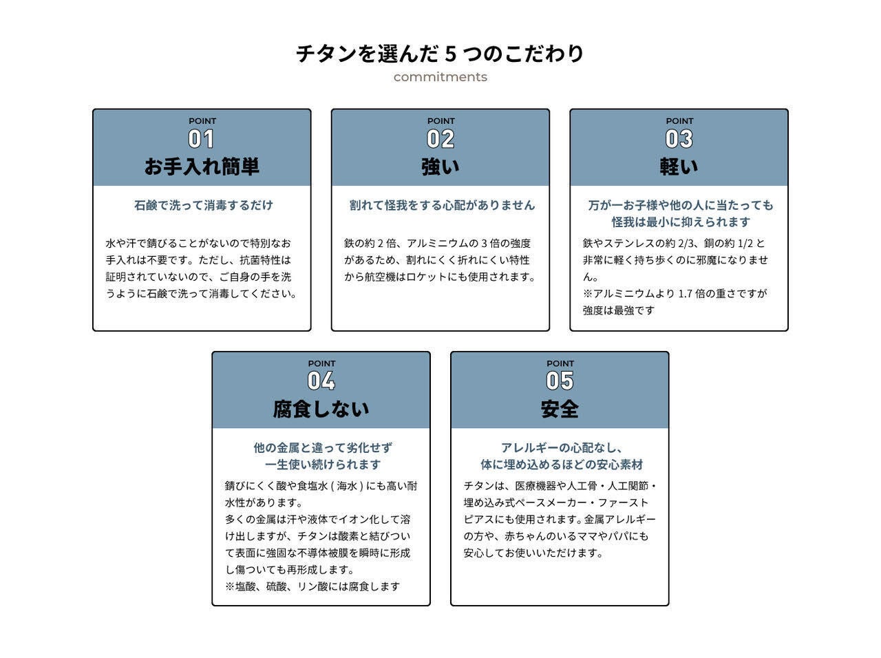 チタンは、医療現場でも体内に埋め込める金属素材。金属アレルギーの方や、赤ちゃんのいるママやパパにも安心してお使いいただけます。