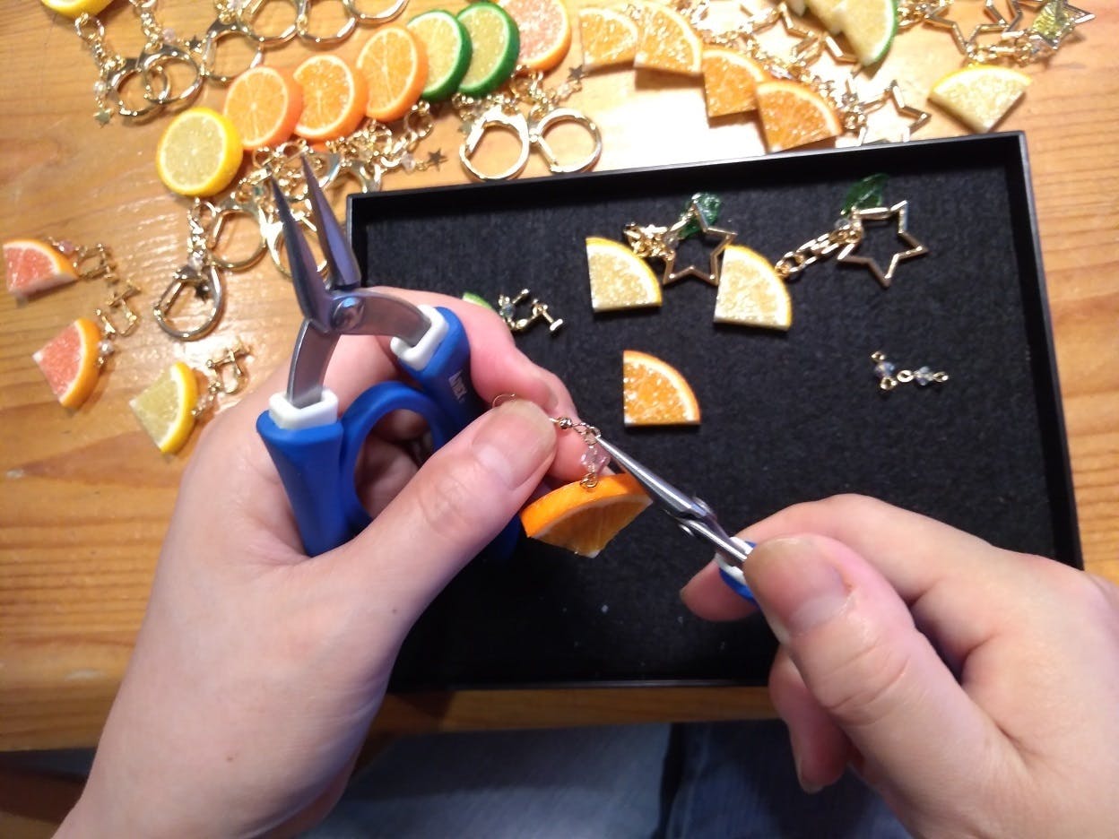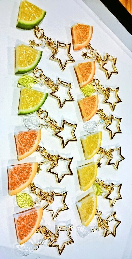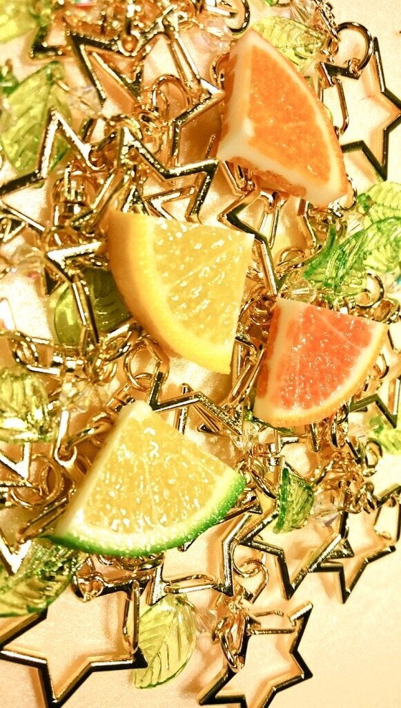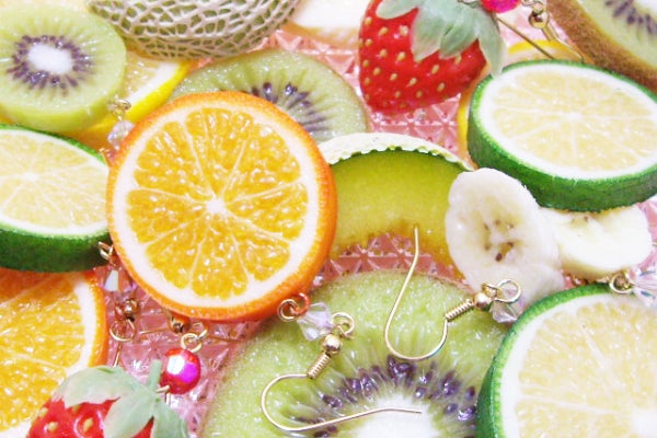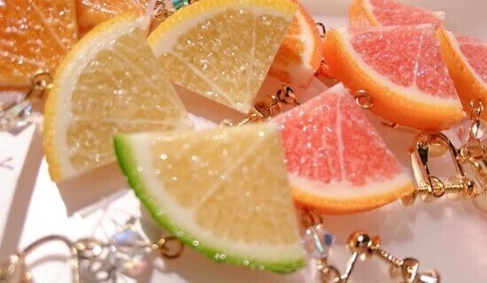 夏に向けた商品として、柑橘系の食品サンプルをアクセサリーや雑貨にした物です。