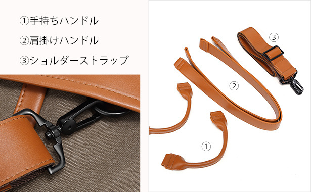 取り外し・取り付けが簡単なショルダーストラップと二種類のハンドルを使い分け、コンパクトなショルダーバッグと大容量収納が可能なハンドバッグに形が早変わり。1つで3パターン楽しめる一石三鳥アイテムです。