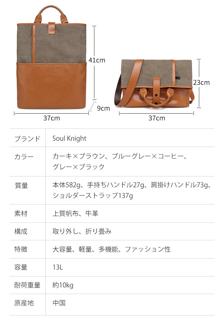 牛革×帆布を合わせたシンプル且つスタイリッシュなデザインは性別や年齢を選ばずに使用が可能。多様なポケットが搭載されており、荷物整理や収納力、バッグの耐久性も高く文句なし。最大13Lの荷物を収納でき、耐荷重量は約10kg!