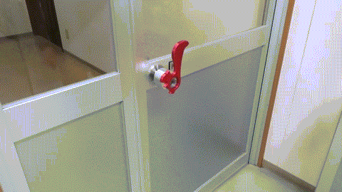 丸型のドアノブは握らないと開けることが出来ません。そこで手のひらからの接触感染防止の観点から、不特定多数の人が触るドアノブを手首を使って開けることが出来るよう、丸型のドアノブにアドオンするグッズを開発しました。