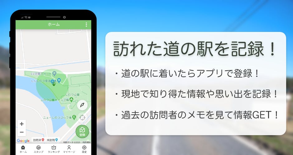 私が学生のときにリリースしたアプリ「みちめぐ」では、実際に道の駅に訪れてアプリでスタンプを登録することで、道の駅の訪問管理や、ランキング機能、道の駅の訪問者だけが知り得た情報を共有することができる機能がございます。(詳しくはアプリ紹介ページをご覧ください)