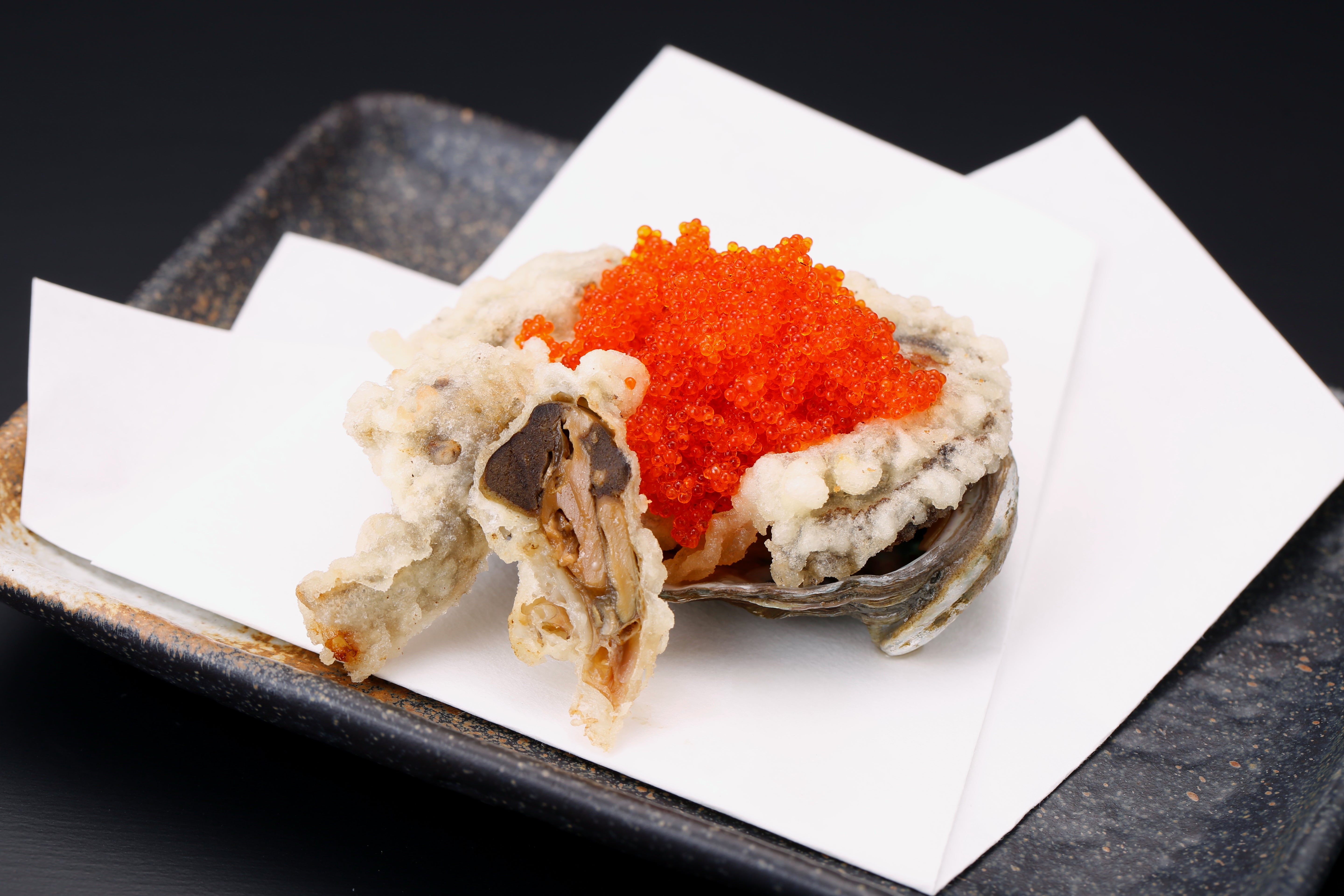 美味しい御出汁で煮た鮑を、天ぷらにしています。