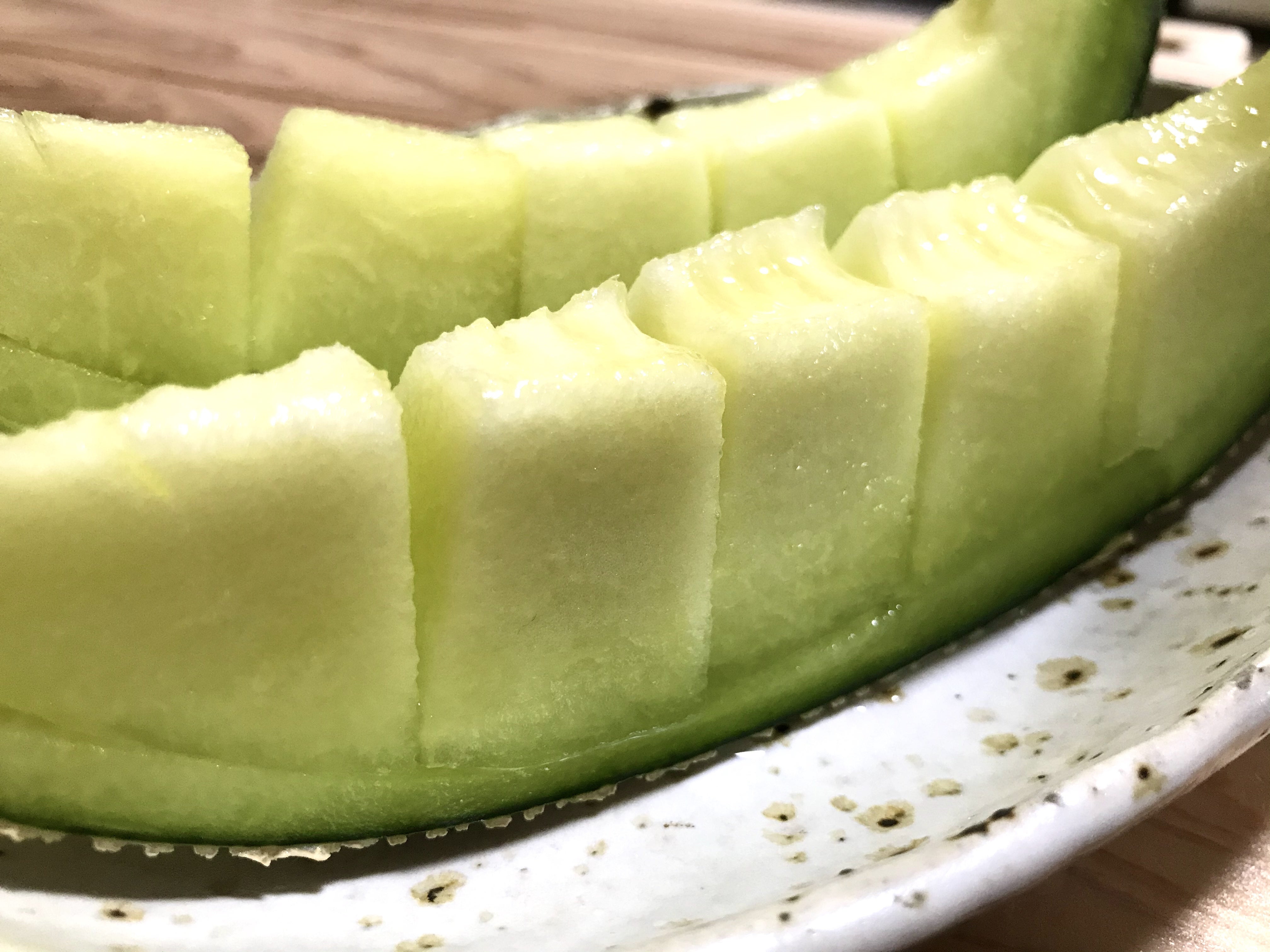 画像は、青肉メロンの写真です。まだ赤肉メロンのみの収穫ですが、青肉メロンもそろそろいい感じに仕上がってきたので、糖度検査をしてみました。