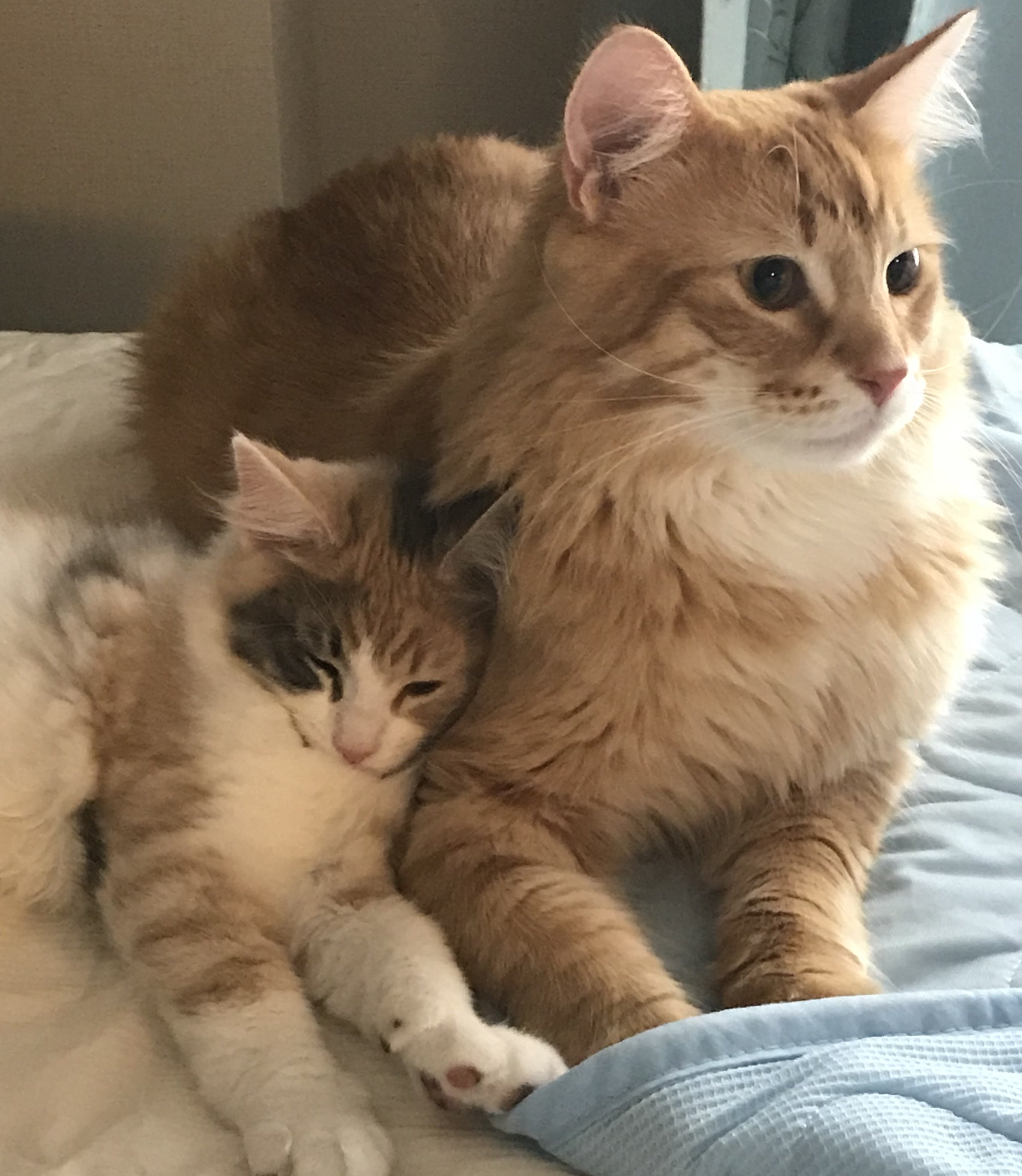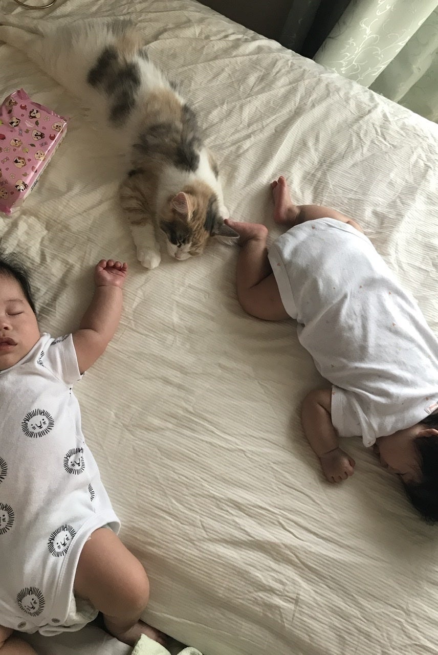 5匹のノルヴェージャンフォレストキャットと、2歳の双子と暮らしています。