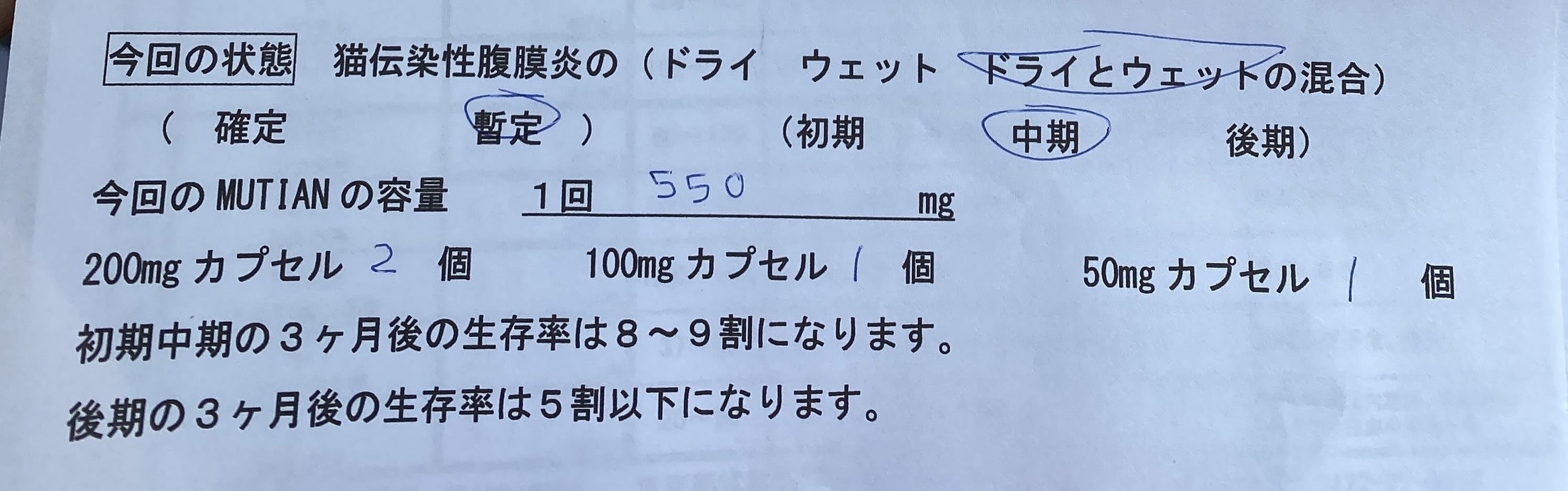 ウェットタイプとドライタイプの混合で、中期FIPと診断されました。