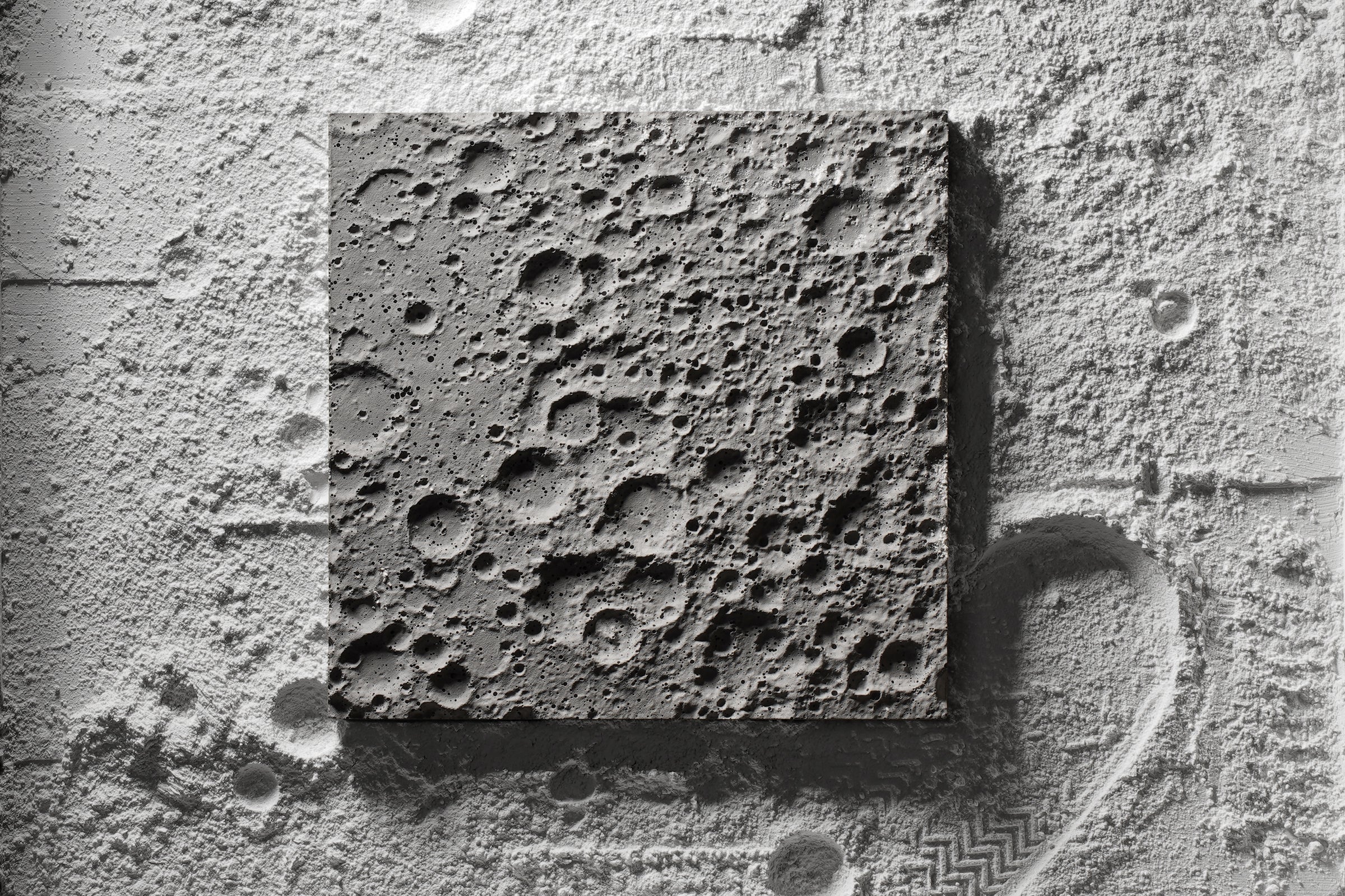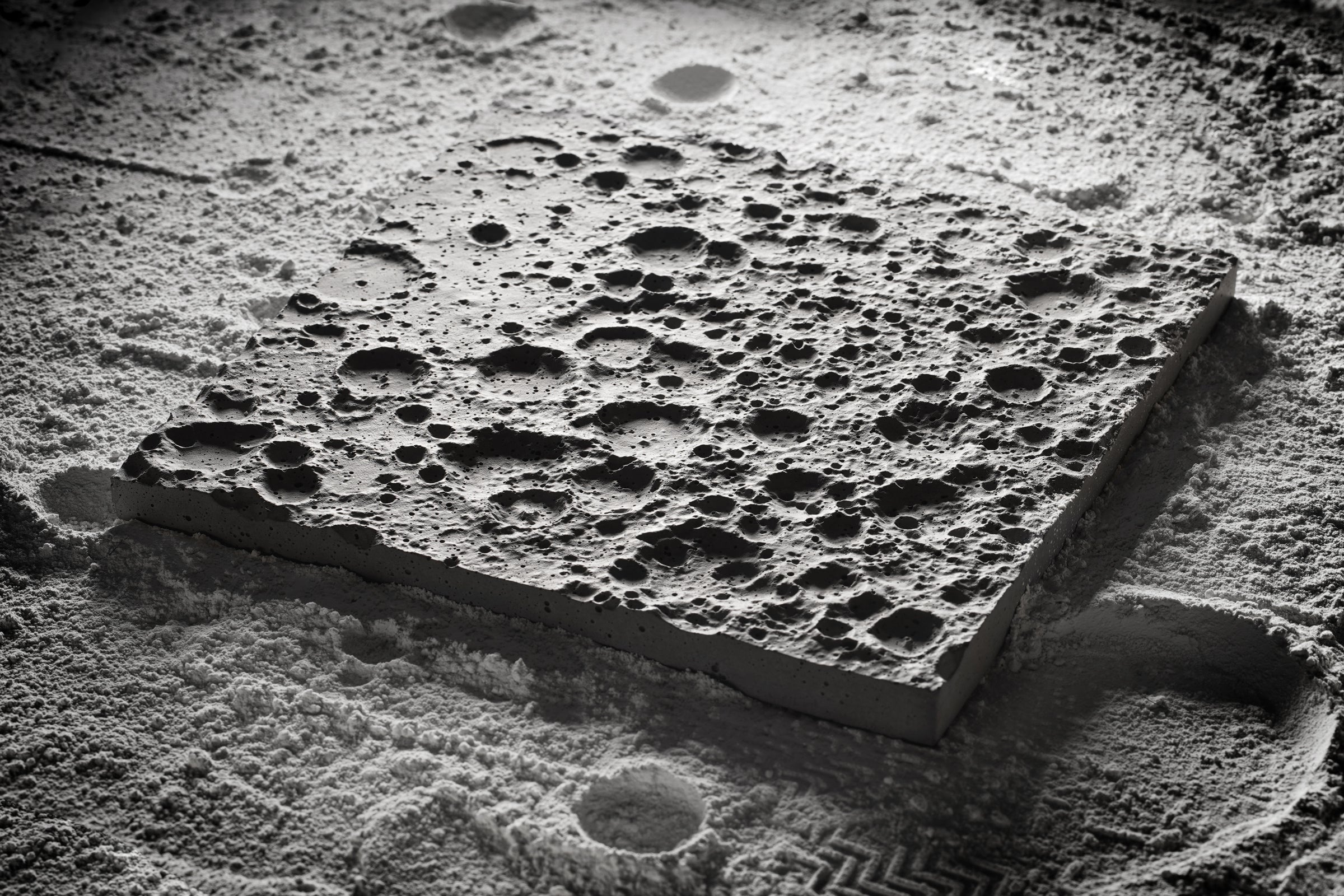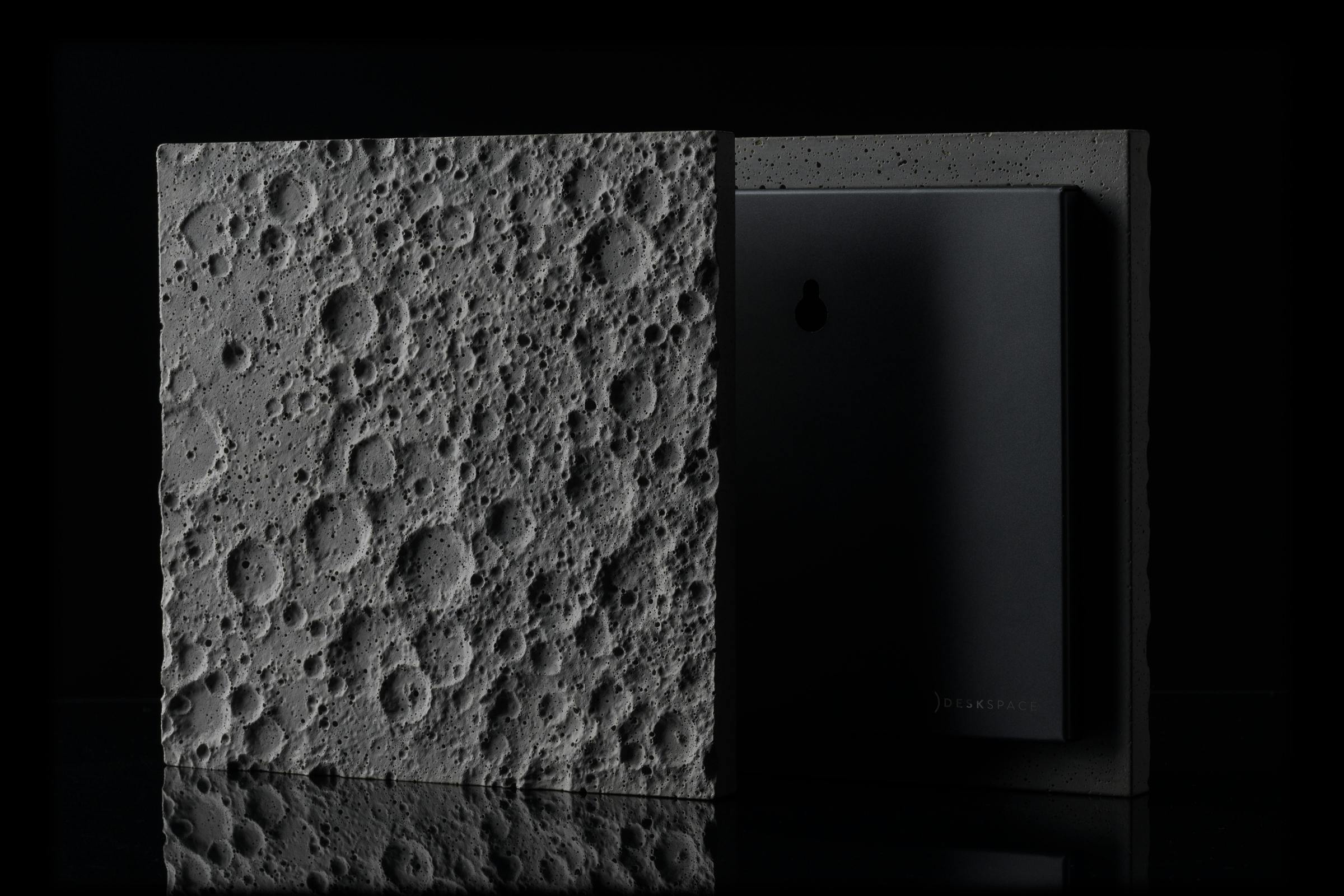 私たちは、ポルトランドセメント素材の独特の美しさに忠実であり続けたいと考えました。クレーターのユニークな表情を最大限に引き出すには、面に対して平行に照明を当て、複雑な月面の凹凸や影を強調することをお勧めします。これは、大型の作品を壁に掛けたり、卓上に飾ったり、いずれの場合でも実現できます。