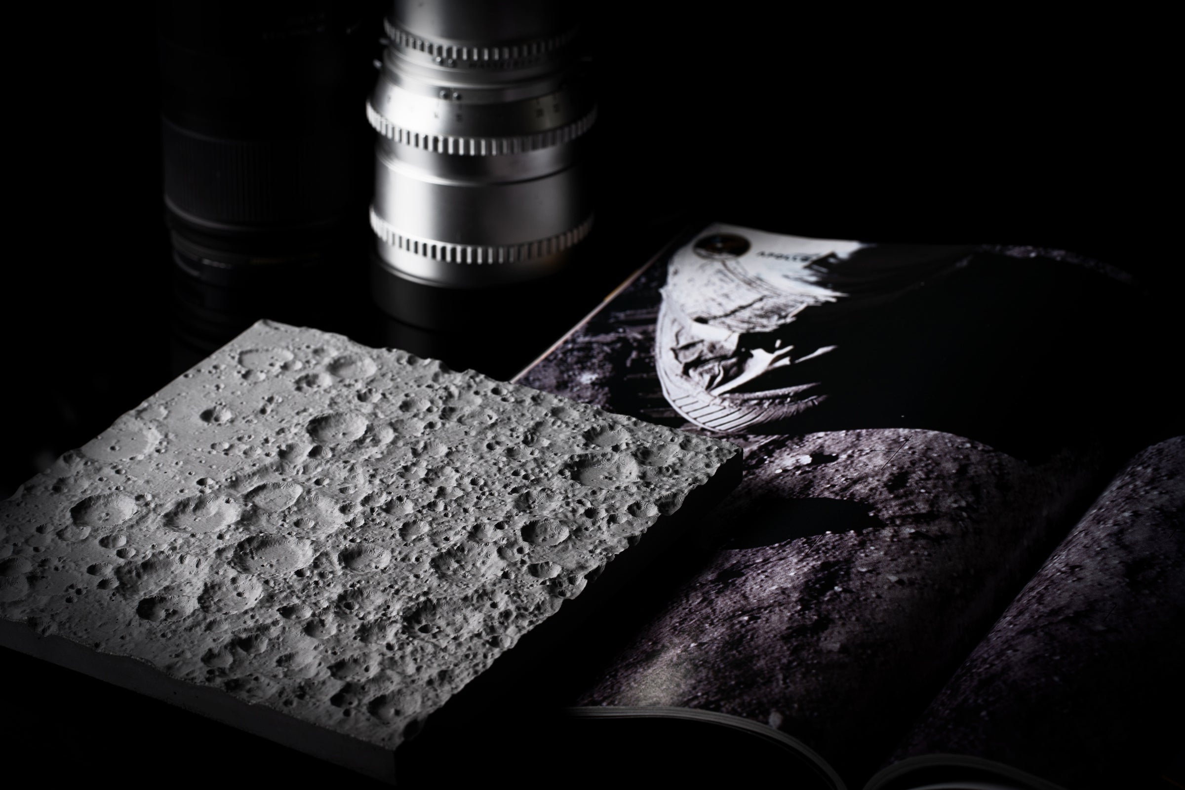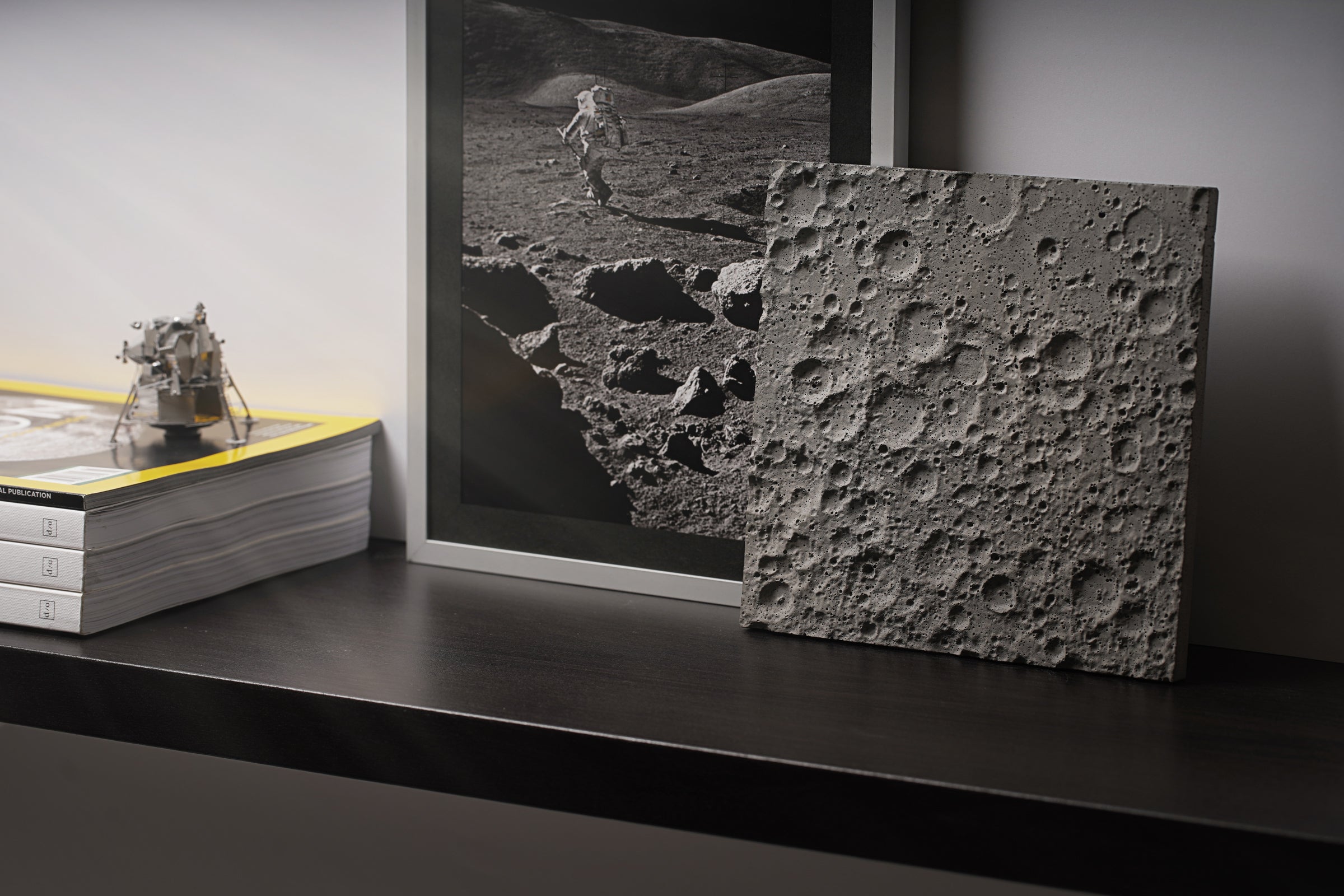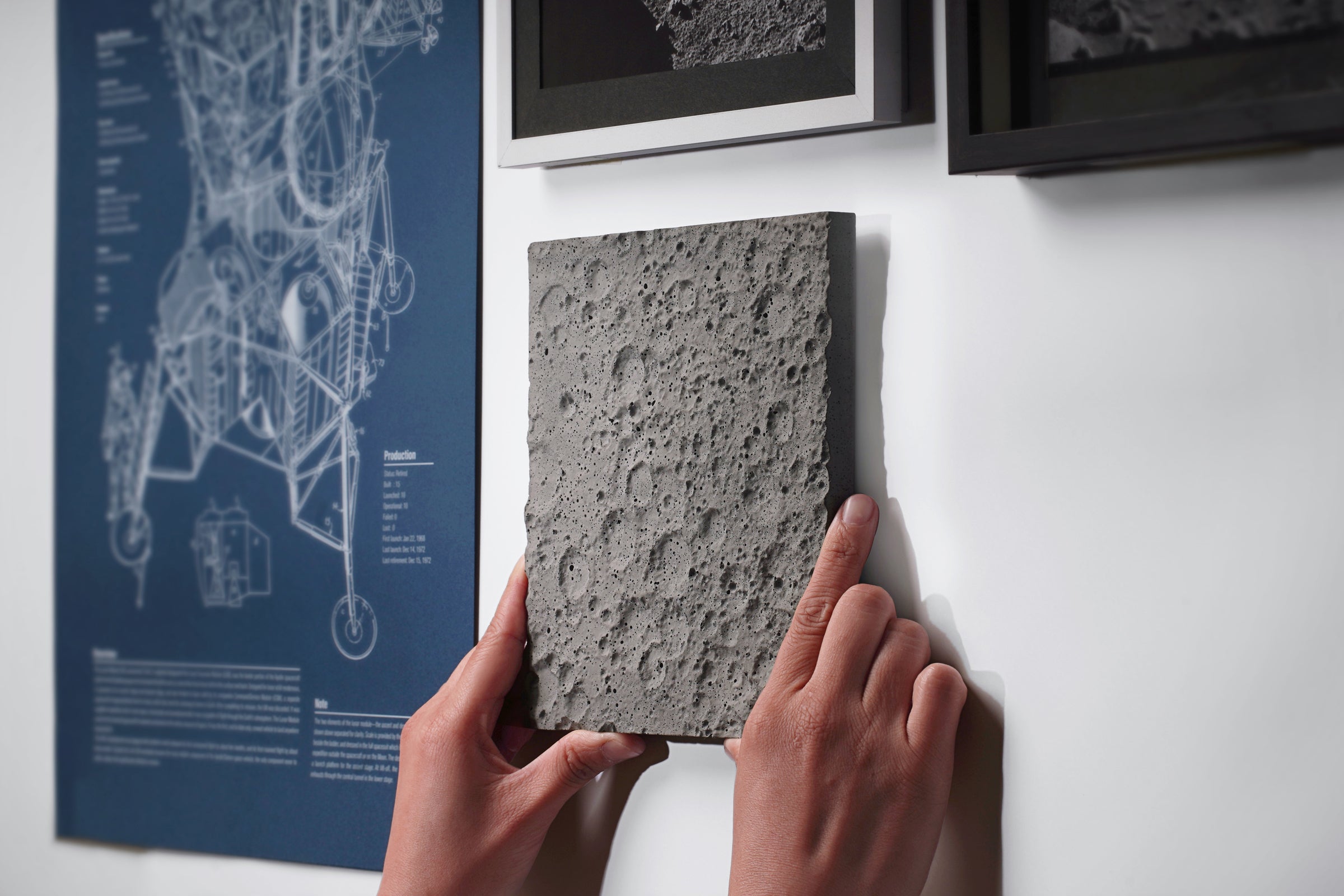 私たちは、ポルトランドセメント素材の独特の美しさに忠実であり続けたいと考えました。クレーターのユニークな表情を最大限に引き出すには、面に対して平行に照明を当て、複雑な月面の凹凸や影を強調することをお勧めします。これは、大型の作品を壁に掛けたり、卓上に飾ったり、いずれの場合でも実現できます。