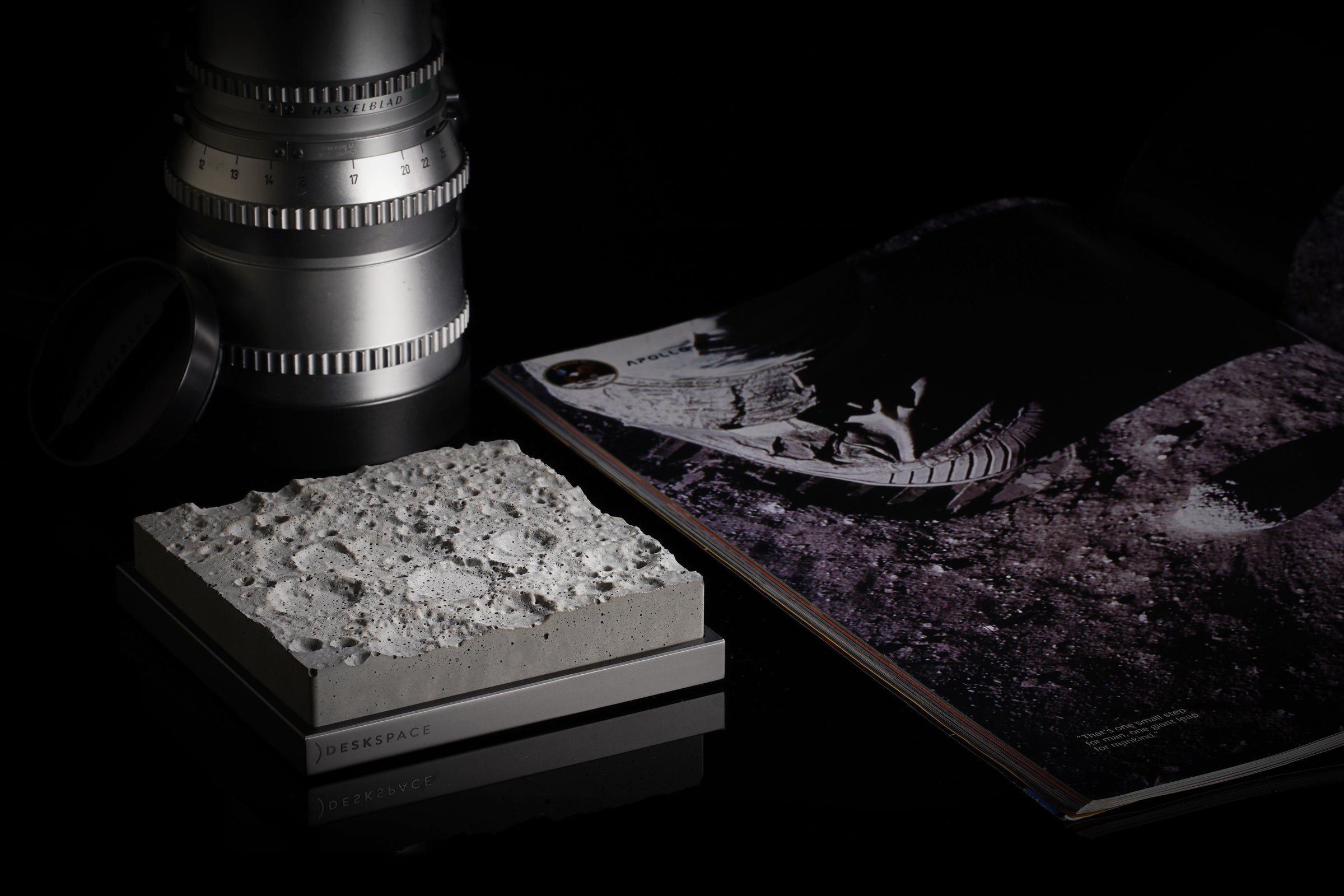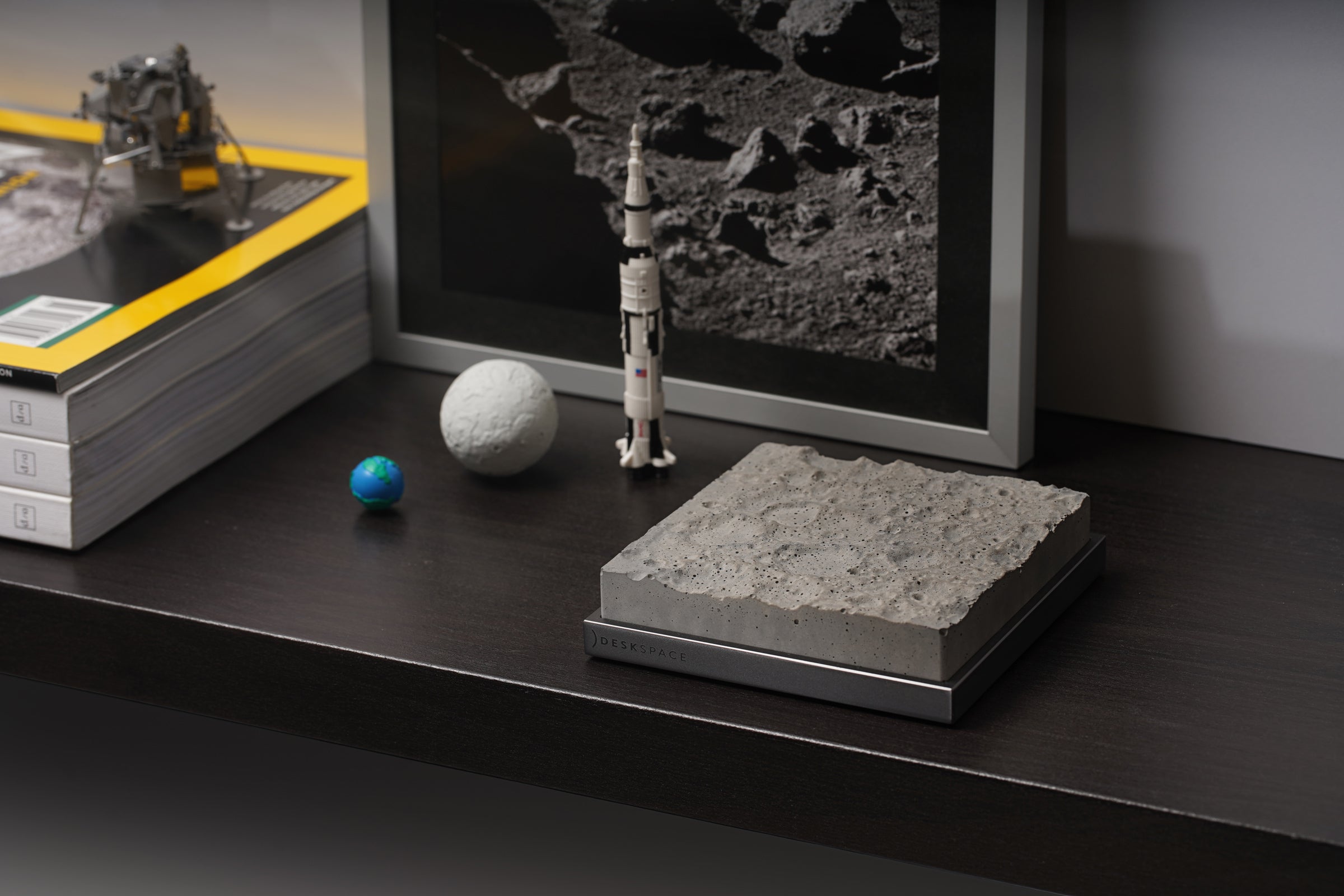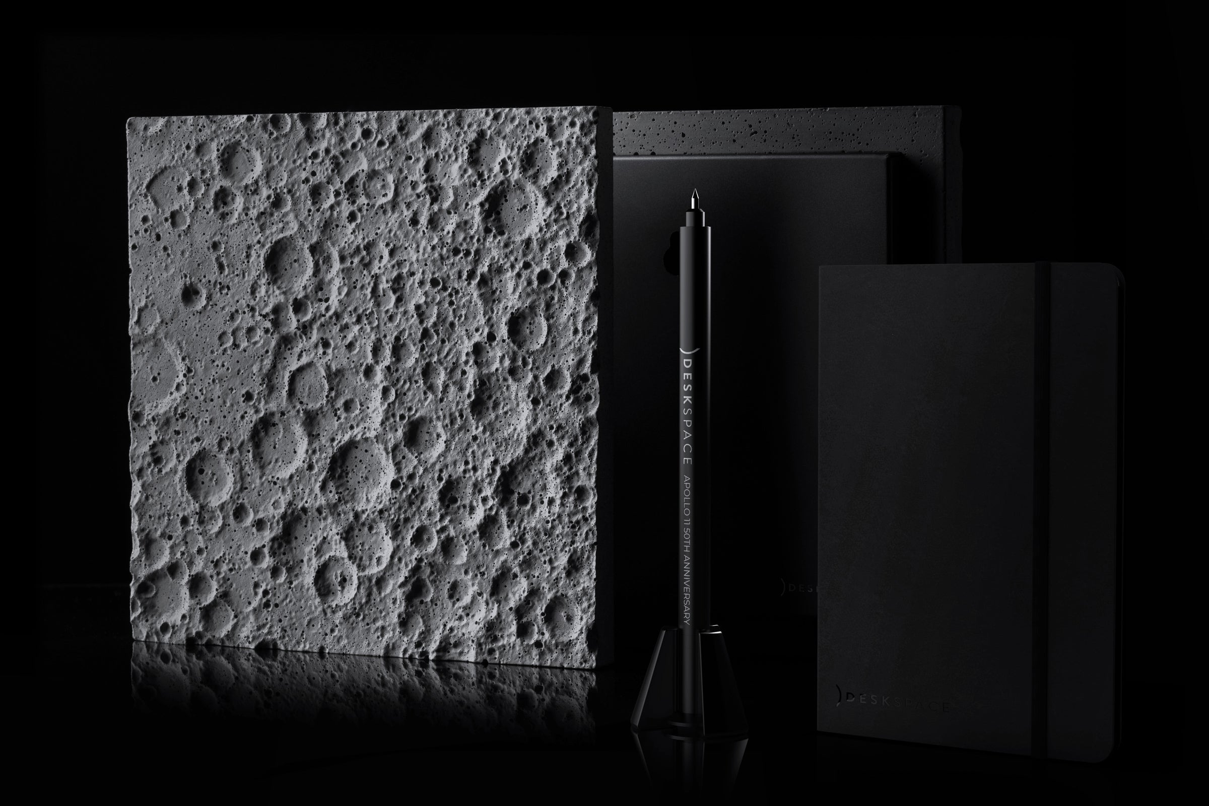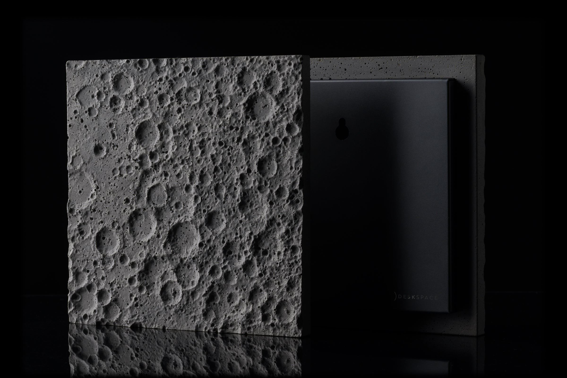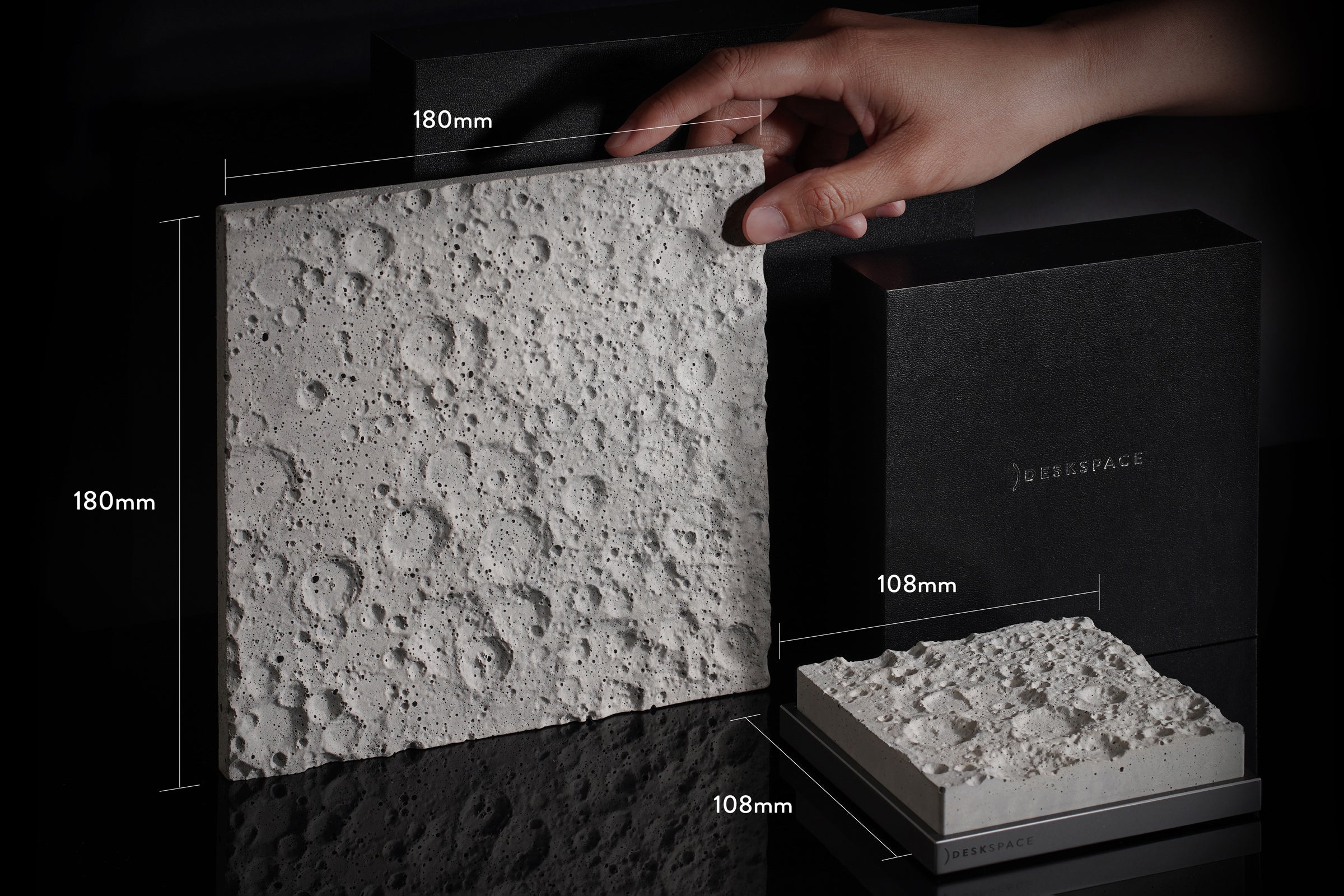 100mm x 100mmのコンクリート片であるこの精巧な月面モデルは、精密な機械加工、アルマイト処理の施された土台を持ち、磨きあげのミラーロゴがあしらわれています。このアイテムは、他のすべてのDeskSpace作品とマッチし、美しい宇宙をテーマにしたコレクションを形成します。細部へのこだわりと一貫した美しさが徹底されています。