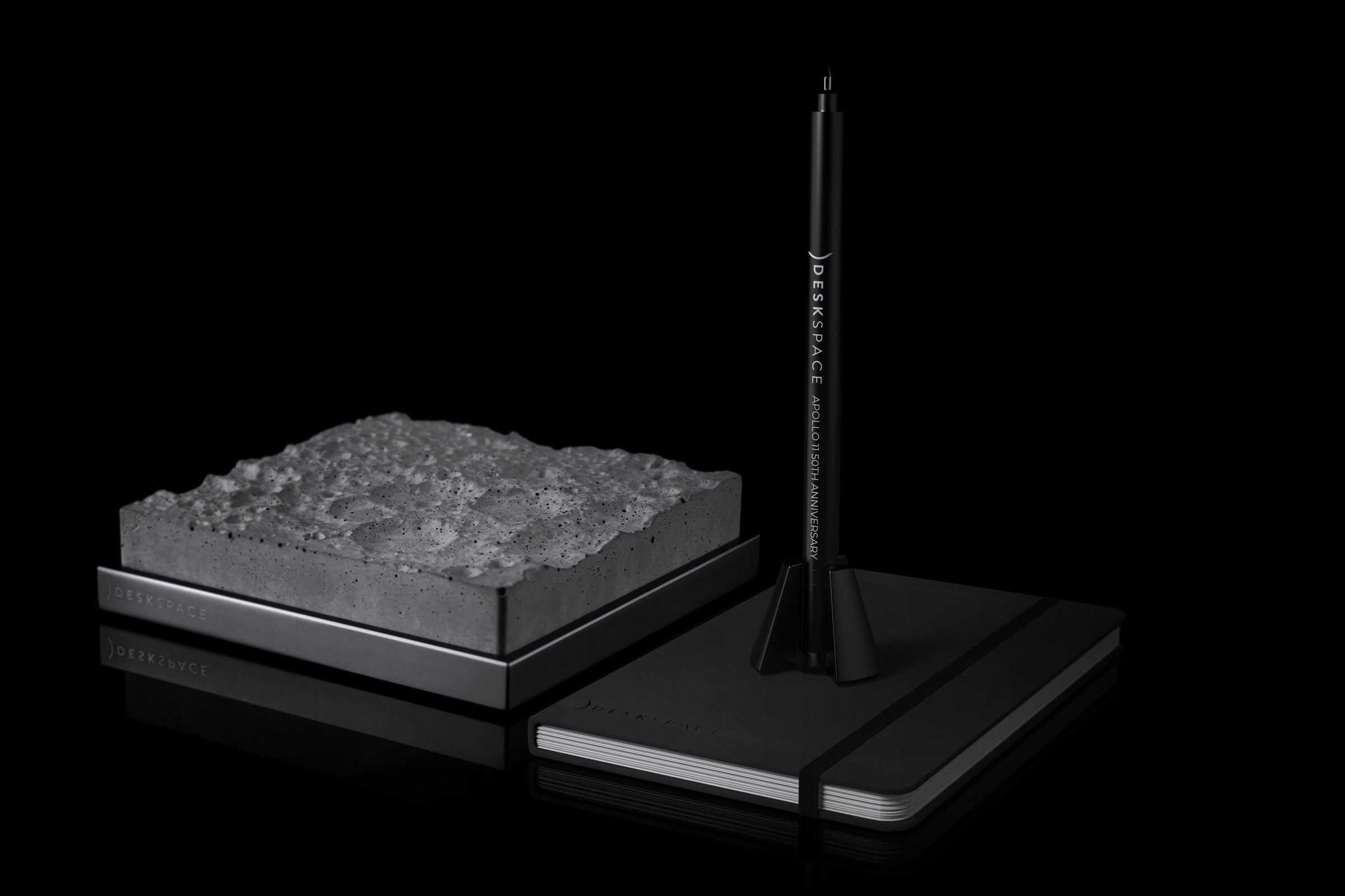 勇敢なアポロ11号のミッションに敬意を表し、完全特注のボールペンとロケットスタンドを作成しました。アポロペンには威厳があり、いつでも月面へ向け地球を飛び立つ準備ができている迫力も圧巻。これを使用するたびに、星への到達のために奮闘した人類の偉大な進歩の記憶が蘇ります。また、左下隅にDeskSpaceロゴがデボス加工された、カスタムメイドのハードバックノートブックも含まれています。