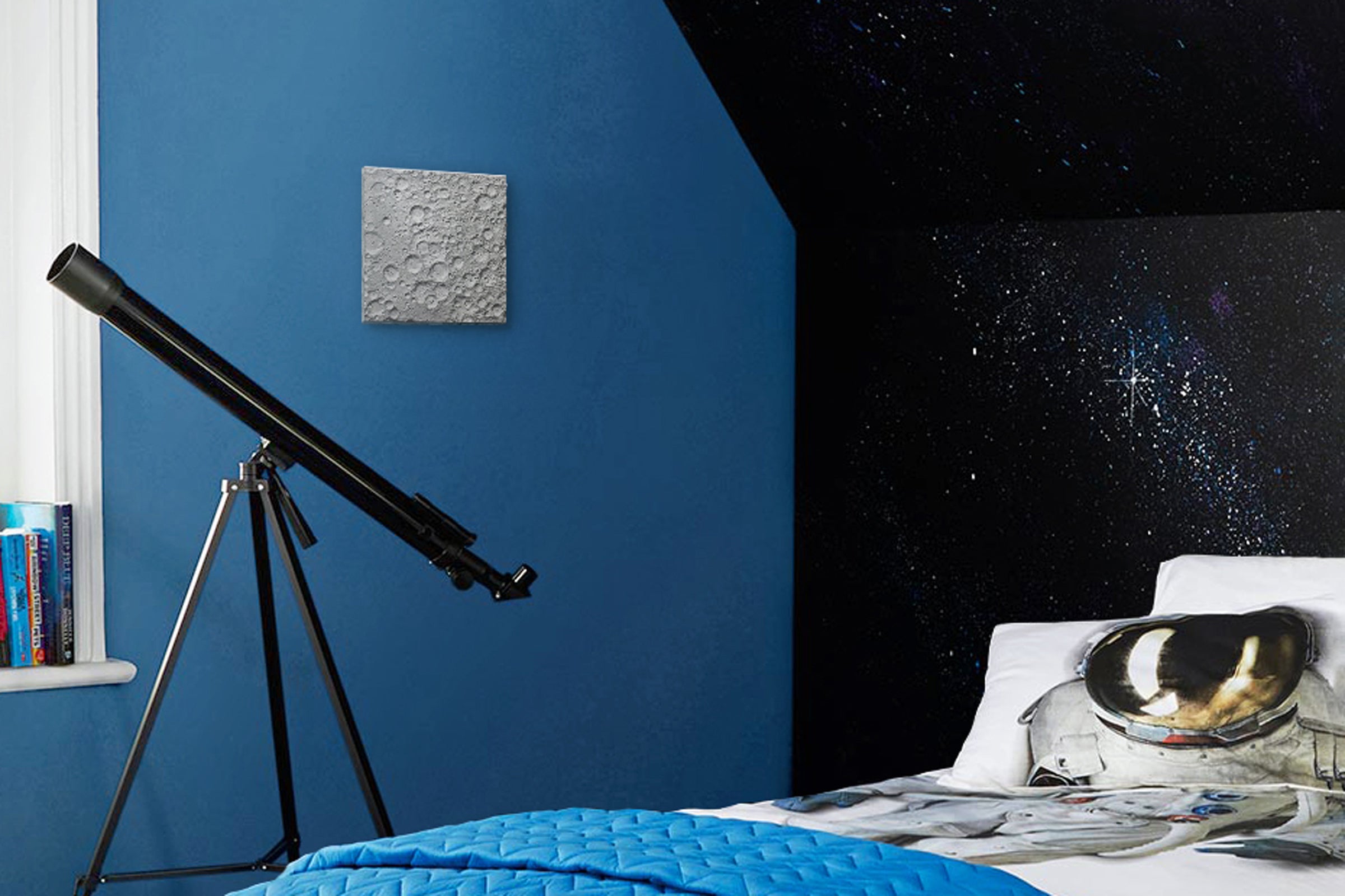 180mm x 180mmのこのディスプレイ用作品は、壁や棚に最適です。何百万年にもわたる隕石の絶え間ない衝突により、クレーターがあちらこちらにある、月面の最も美しいエリアを詳細に表現しています。月面のこの段階的な変化の様子が、最終的に、私たちがよく知る独特の外観へと繋がっています。