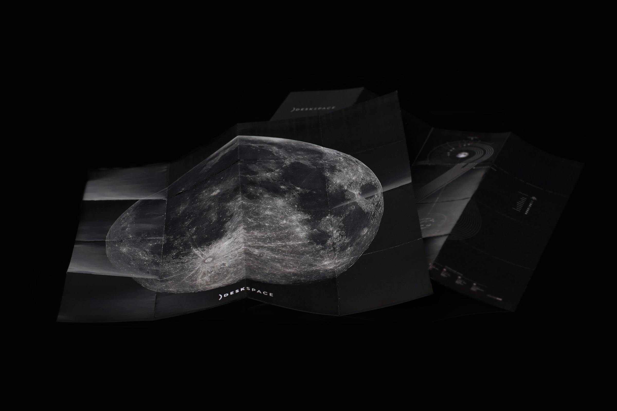 DeskSpace月面には、月と月面着陸に関する興味深く、知的好奇心を刺激する、楽しい事実でいっぱいの高品質かつ重厚感のある本が付帯します。本には詳細な画像が使われており、箱の中にぴったり収まる特徴的デザインです。これが、月の全容を明らかにします。月面と完璧に調和し、好奇心を土台として、すべての宇宙愛好家への素敵な贈り物に。