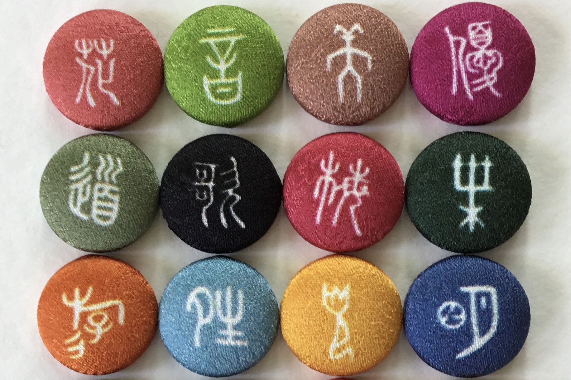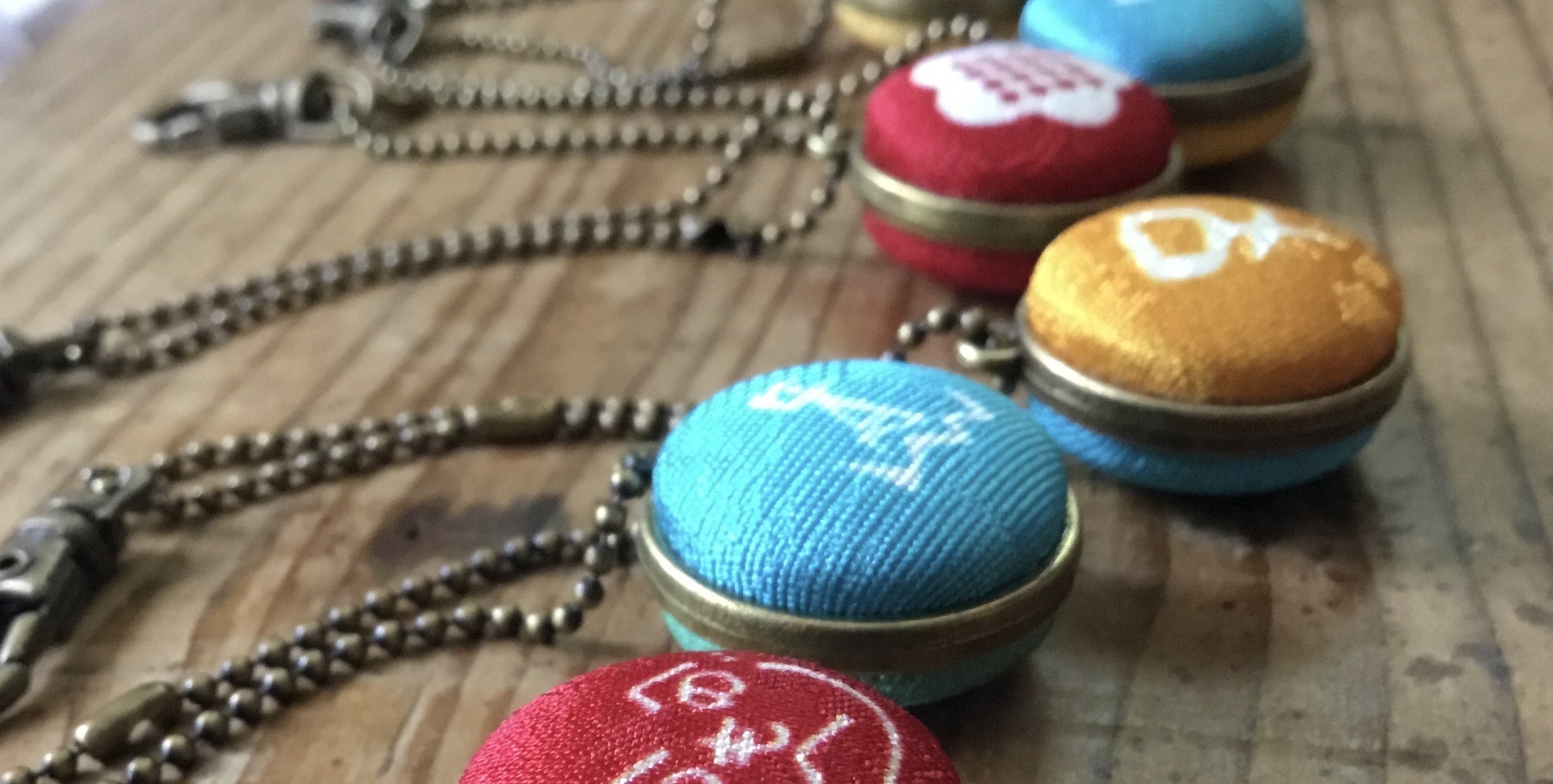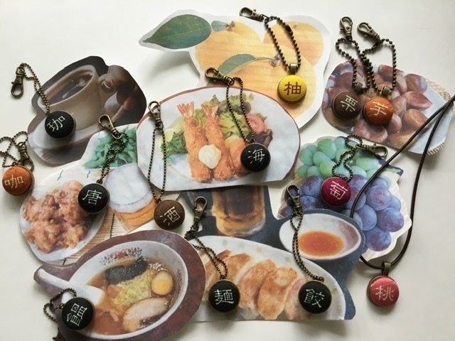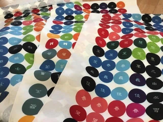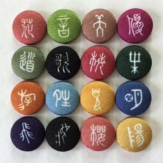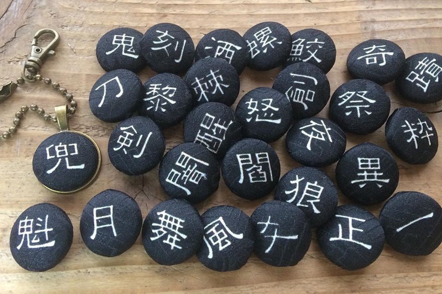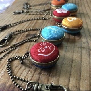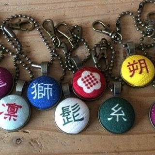 京都の友禅工場で、着物地に漢字や古代文字などをプリントし、それをくるみぼたんに加工したものをズラリと並べ、好きな文字を選んでいただいて、アクセサリーなどをお作りする、というスタイルで活動してきました。
