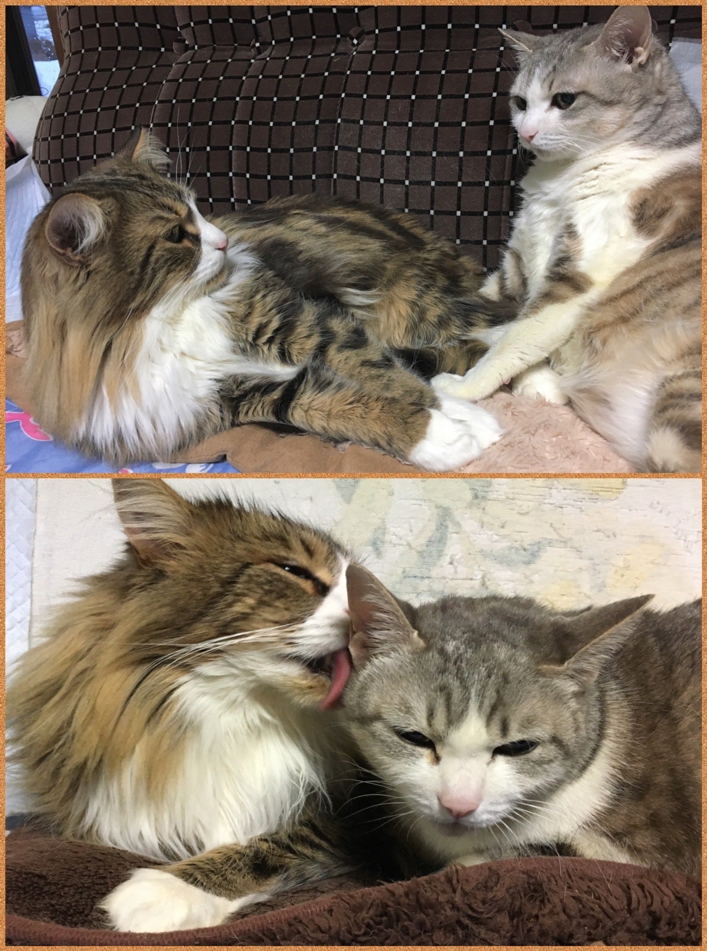 当時こまこより先に家で暮らしてた先住猫は病気のため5歳ほどの若さで虹の橋を渡ってしまいました。その後はしばらく1匹で家族と暮らしていましたが、こまこが7歳くらいになった頃に父がメインクーン♂のチャチャを連れてきて一緒に飼うことになりました。