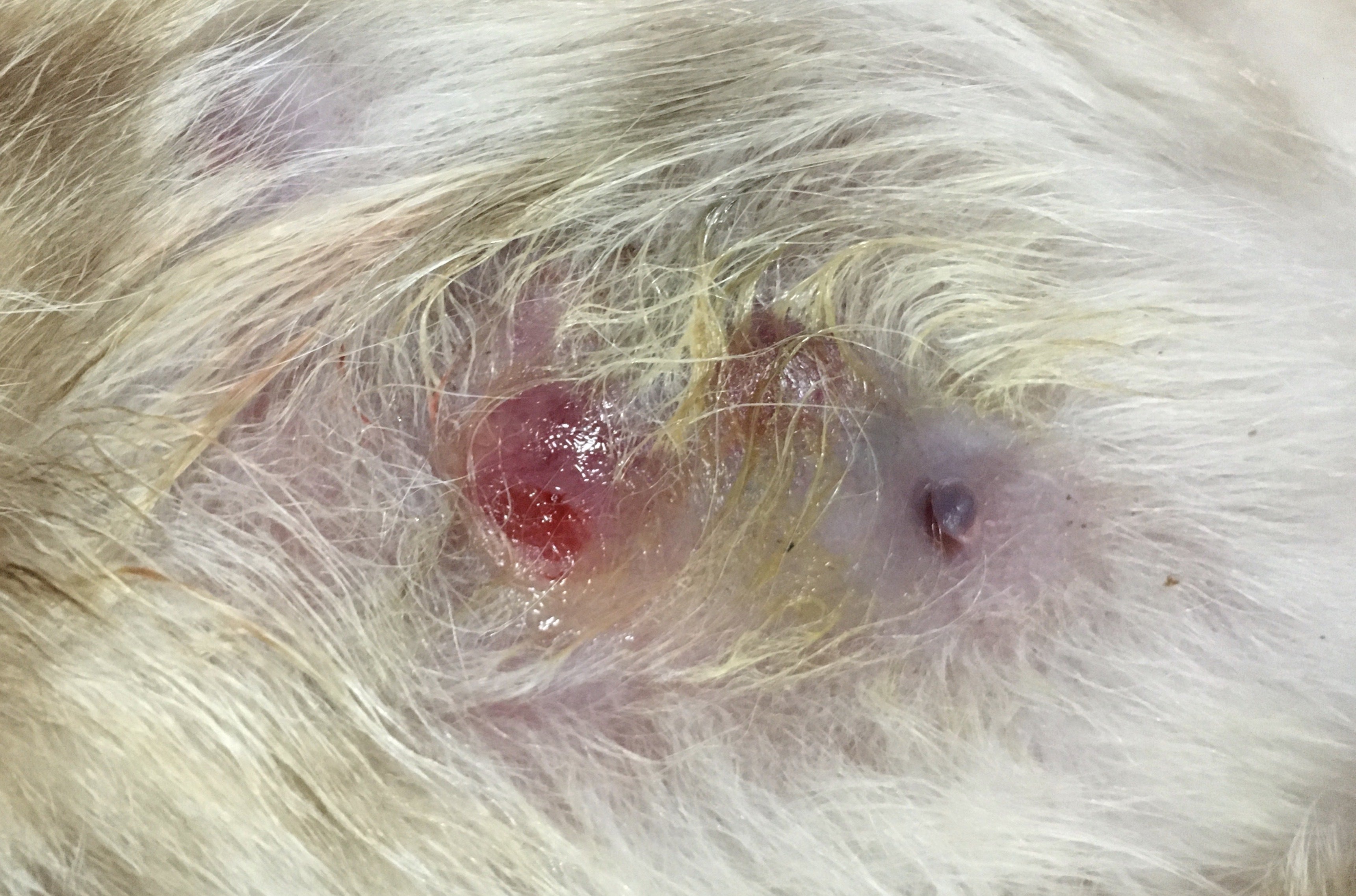 現在の状態。乳腺腫瘍が肥大化し皮膚の表面に出てきてしまっています。