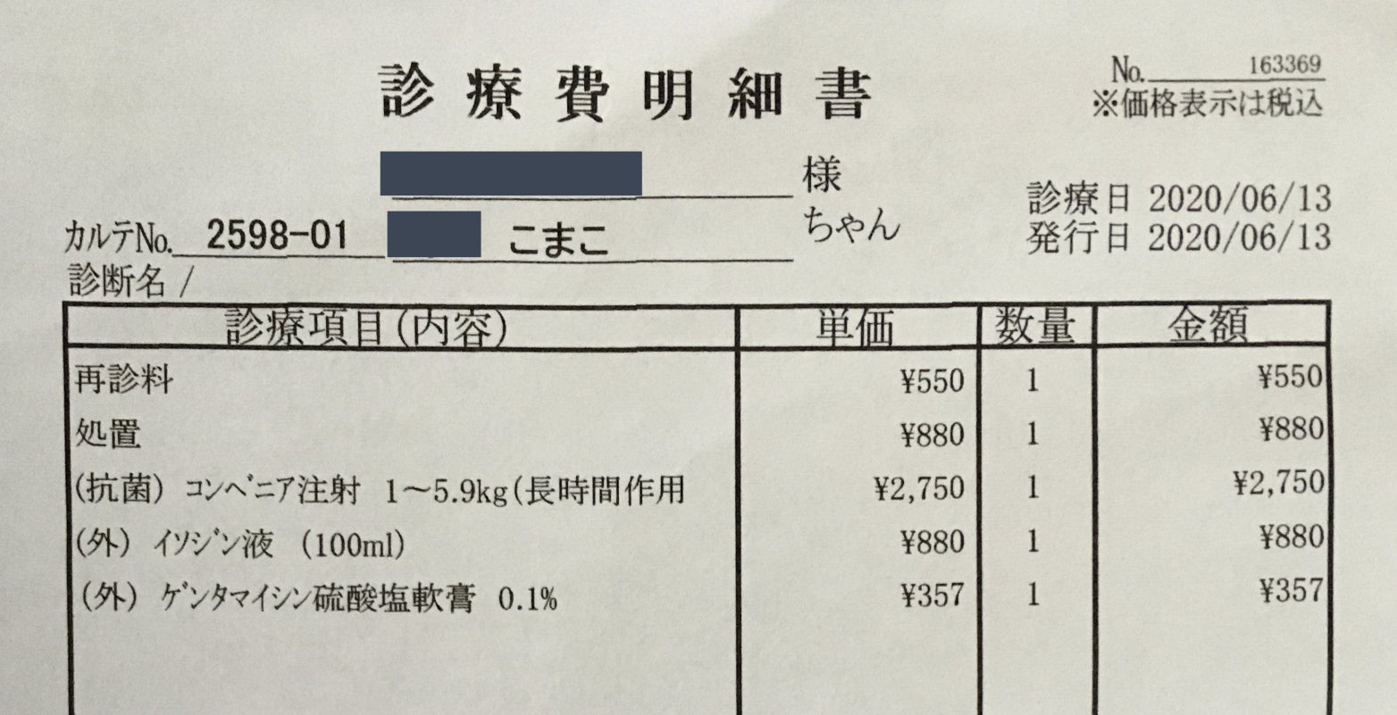 初日は注射と消毒措置のみだったので少額で済みましたもしも手術後に転移や再発が見られた場合には年齢と体力を考慮し再手術は行わず、投薬による治療をしていく予定です。