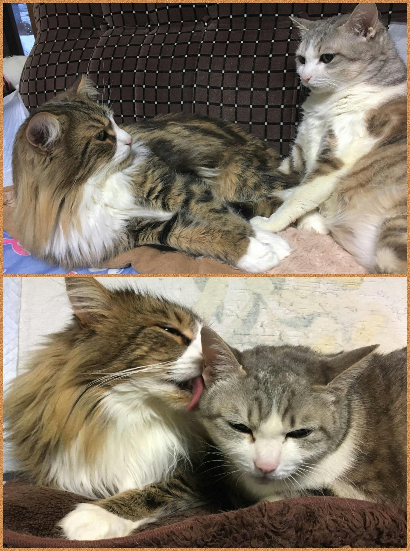 初めて見る子猫に戸惑いストレスで痩せたりもしましたが、チャチャはすっかり大きくなり今はたまに喧嘩しつつも2匹仲良く暮らしています。